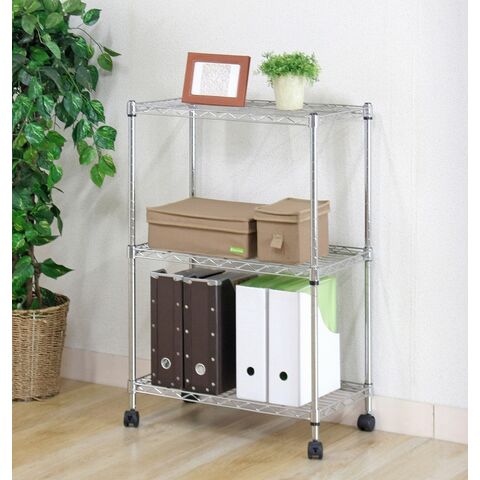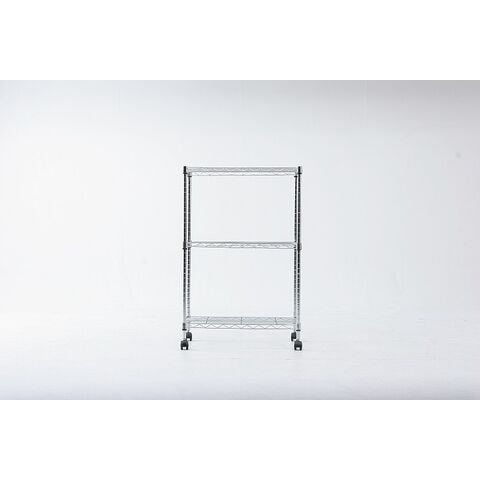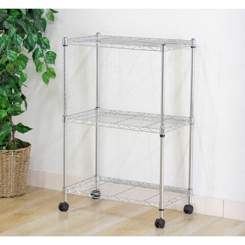 無駄な装飾を一切無くしたシェルフです。錆びにくいクロムメッキ加工を施しております。キャスター付きで移動もラクにできます。