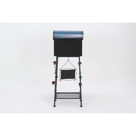 バラのオブジェをあしらったオシャレなメールボックスです。下部には棚が付いており、ちょっとした鉢植えなどを置くことができます。ボックスの屋根部分がふたになっており、そこから中身を取り出すことができます。