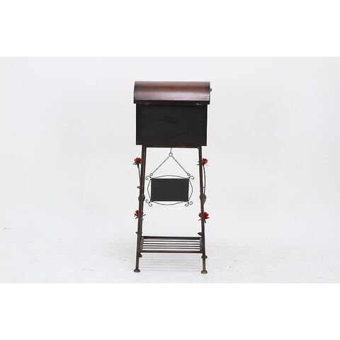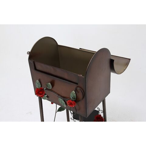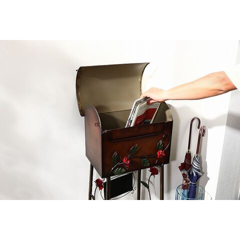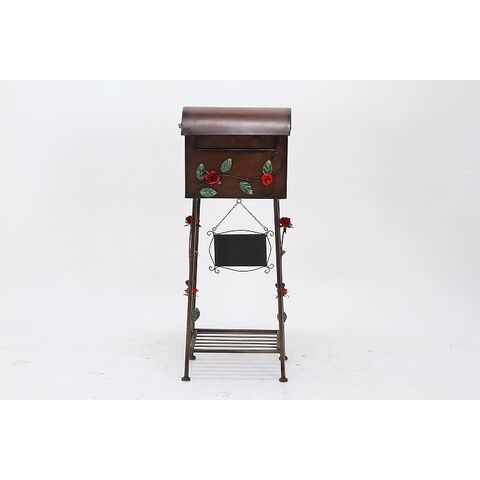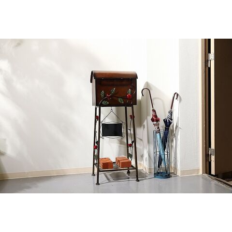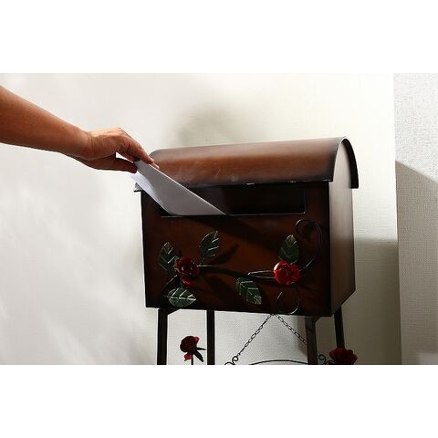 バラのオブジェをあしらったオシャレなメールボックスです。下部には棚が付いており、ちょっとした鉢植えなどを置くことができます。ボックスの屋根部分がふたになっており、そこから中身を取り出すことができます。