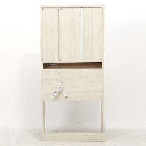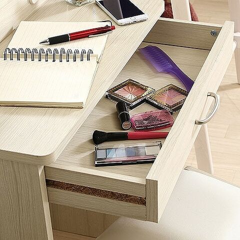 三面鏡付きのドレッサーです。収納スペースもたっぷりと確保しており、かさばるメイク道具もスッキリと片付きます。コンセント2口付きで、ヘアアイロンやドライヤーなども使用できます。