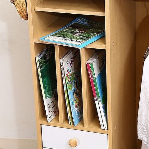ナチュラルとホワイトの男女問わず使用できるカラーです。ラックの左右にはフックが付いておりバッグやランドセルを掛けることができます。キャスター付きで移動もラクにできます。