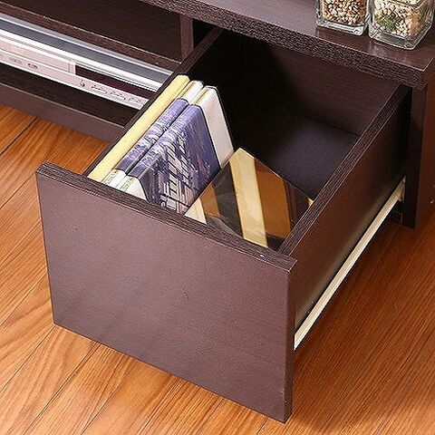 木目調のシンプルなTV台です。落ち着きのあるダークブラウン色です。左右の引き出しにはDVDやTV周りの小物類を収納することができます。中央の収納部分には背板がなくコードなどを後ろに流すことができます。AV機器の設置などにオススメです。