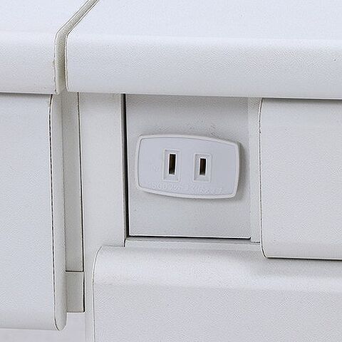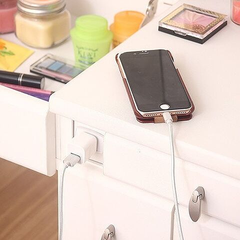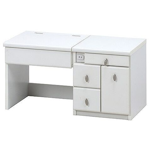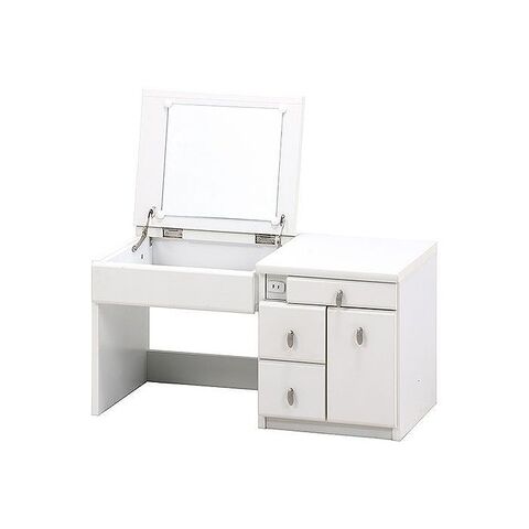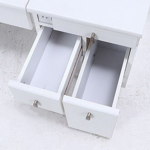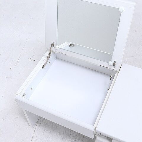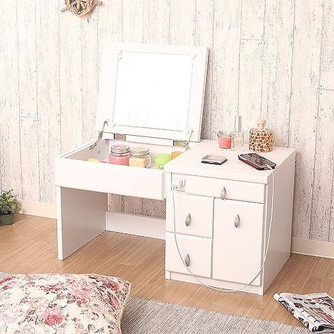 メイク道具もまとめて収納。ふた部分がミラーになっており、閉じるとデスクになります。収納スペースもたくさん確保しておりスッキリと片付きます。コンセント1口付きで携帯の充電やヘアアイロンも使用できます。