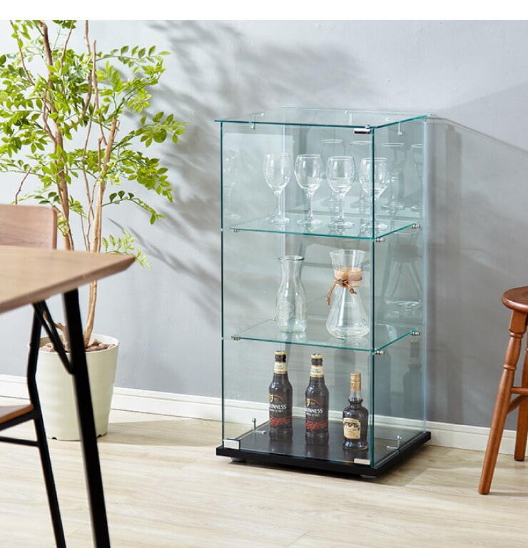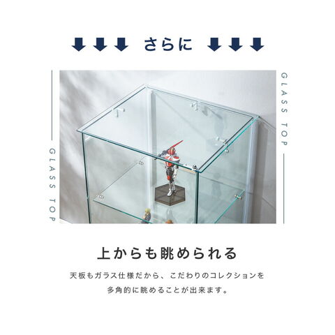 全面ガラス製で360度どの角度からでもディスプレイしたアイテムを楽しむことができます。上部の板もガラスなので、上からコレクションを眺めることができます。