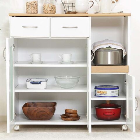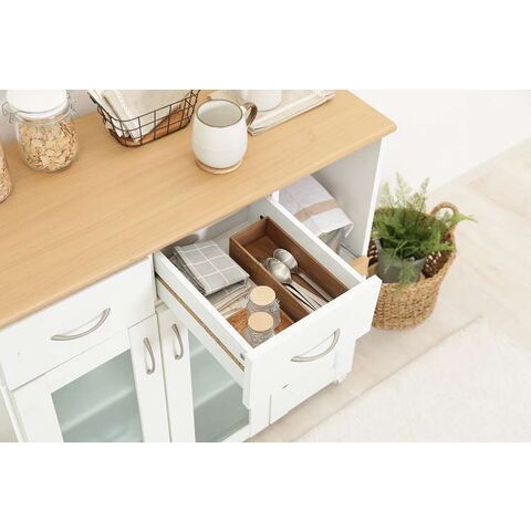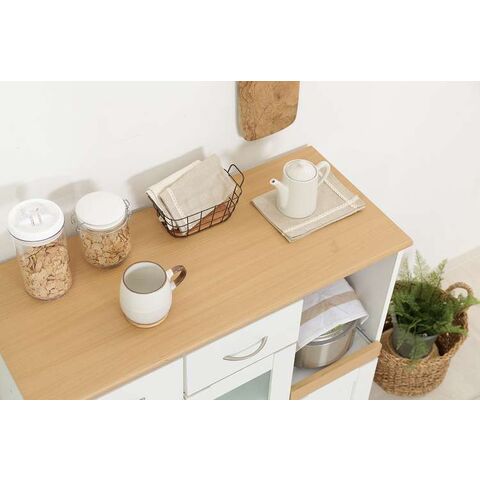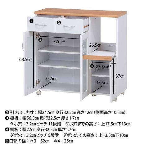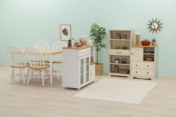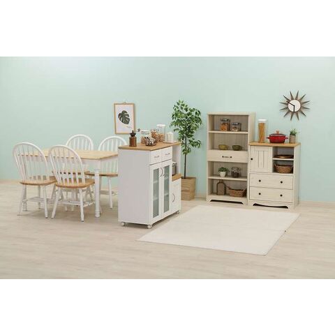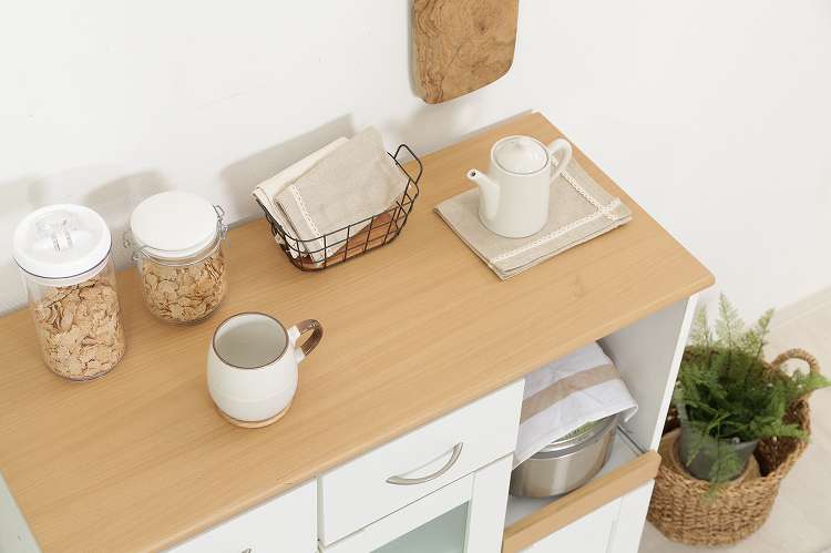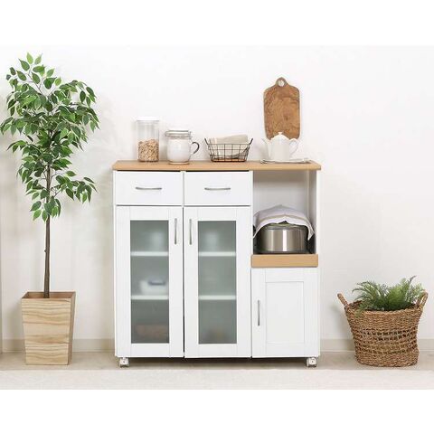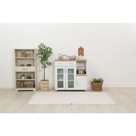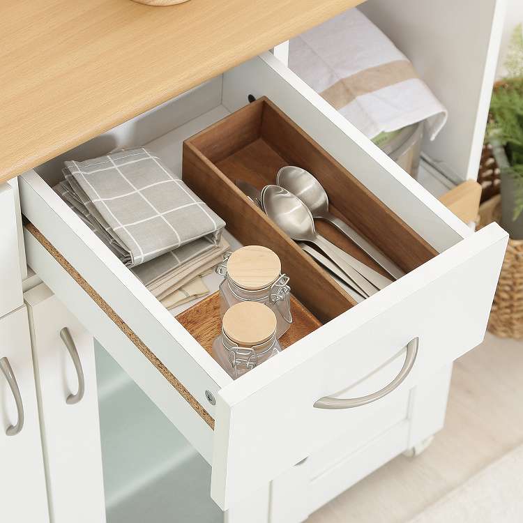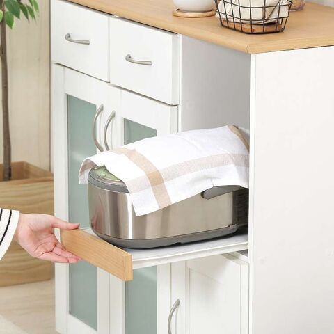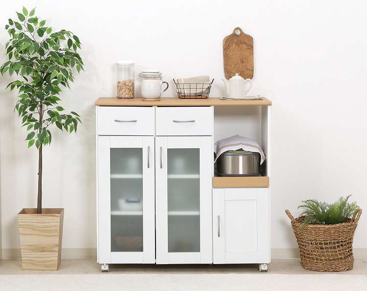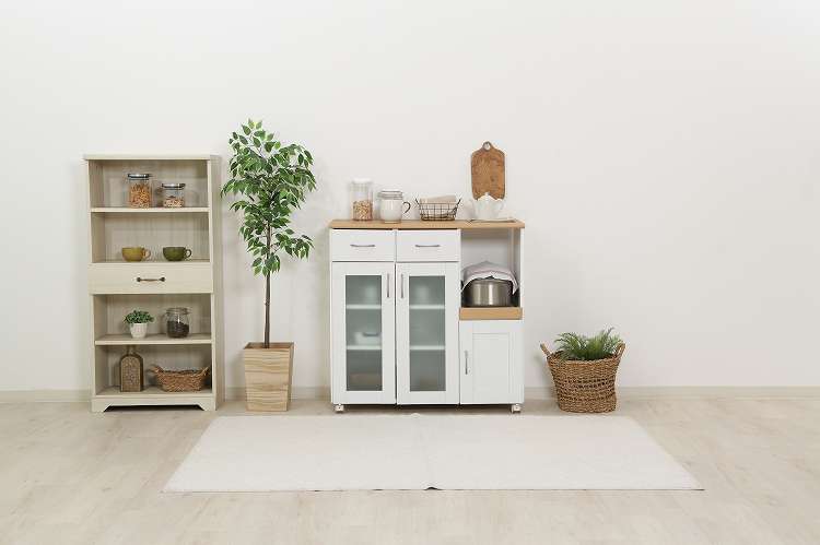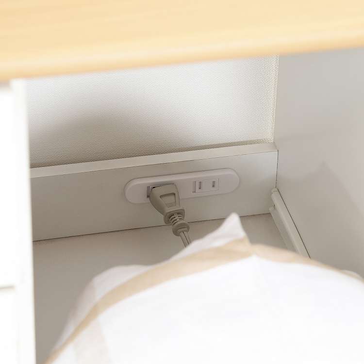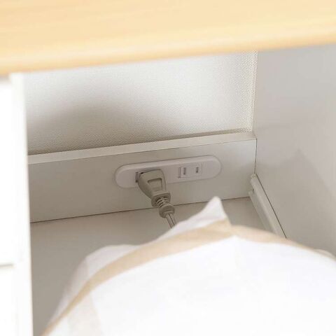 作業効率を上げるキッチンカウンターホワイト×ナチュラルカラーで、どんなインテリアにも馴染みやすいキッチンカウンターです。2つの戸棚に分かれていて、細やかな収納が可能。食器や缶詰、お菓子などスッキリ収納できます。お好みの高さに合わせて、棚の付け替えができます。引き出して使えるスライド棚です。炊飯時やお湯を沸かす際に出して使うことで、蒸気による棚の劣化を防ぐことができます。2つの引き出しにはお箸やランチマットなど、かさばる小物をすっきり収納できます。スライド棚の奥には2口のコンセントがついているので、使い勝手もバツグンです。