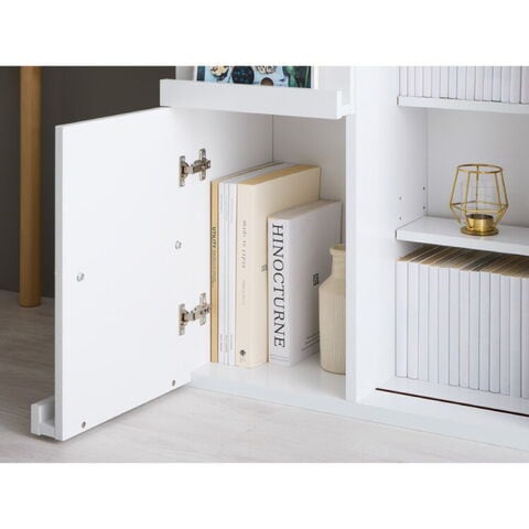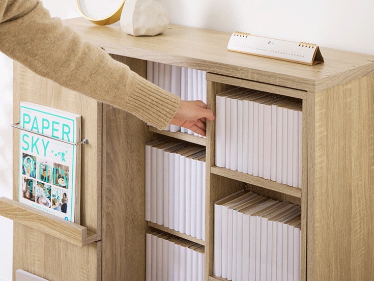 フラップ扉付きで本や小物を魅せたり、隠したりする収納ができます。