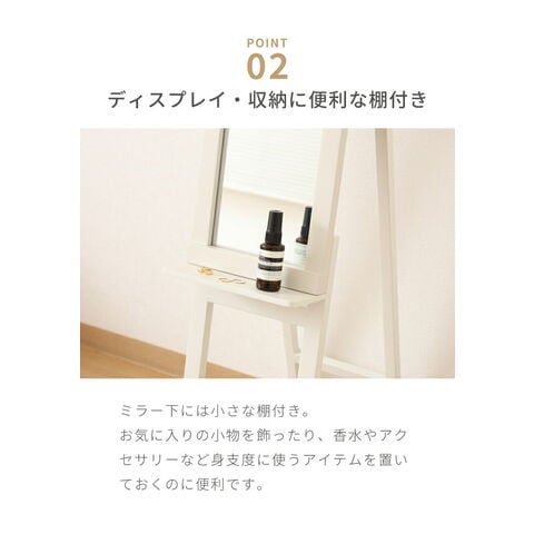 香水やアクセサリーなどの小物が置けるスリムミラー