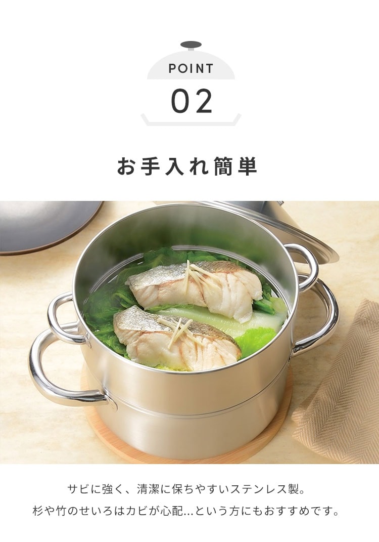 杉や竹のせいろはカビが心配...という方にもおすすめのステンレス製です。