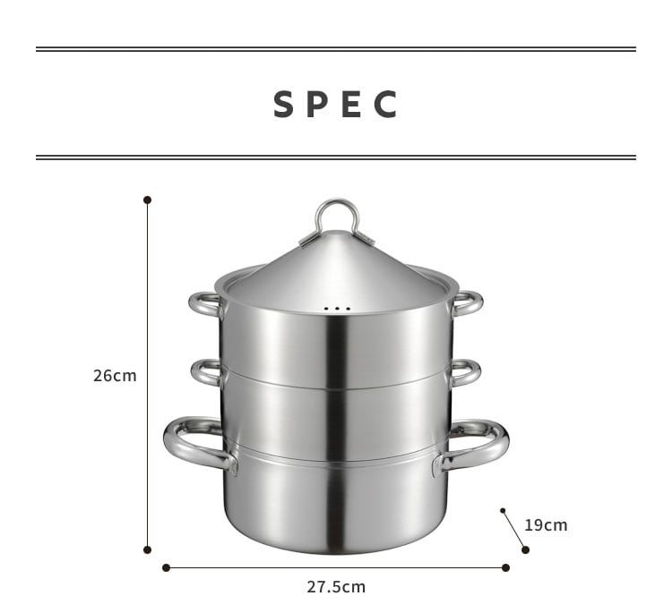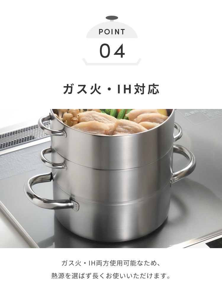 18cm規格のステンレス製蒸し器。フタ1点+上鍋2点+下鍋1点 計4点セットになります。