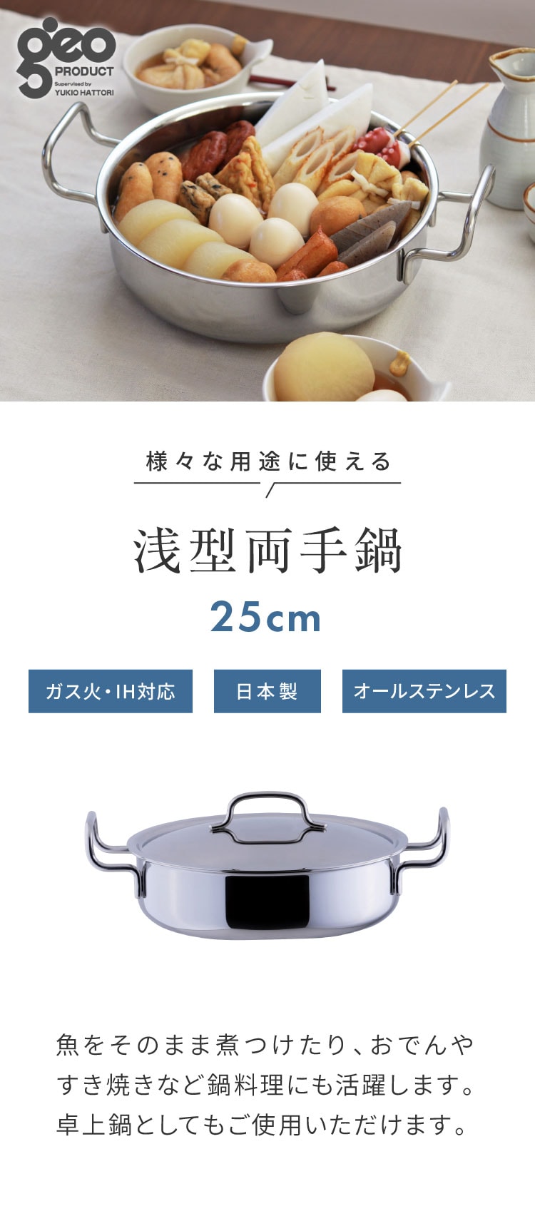 ジオ・プロダクト 日本製 浅型両手鍋 25cm GEO-25S ガス火・IH対応 オーブン可 GEO ジオ 服部幸應先生 国産 宮崎製作所 Miyaco ジオプロダクト【送料無料】