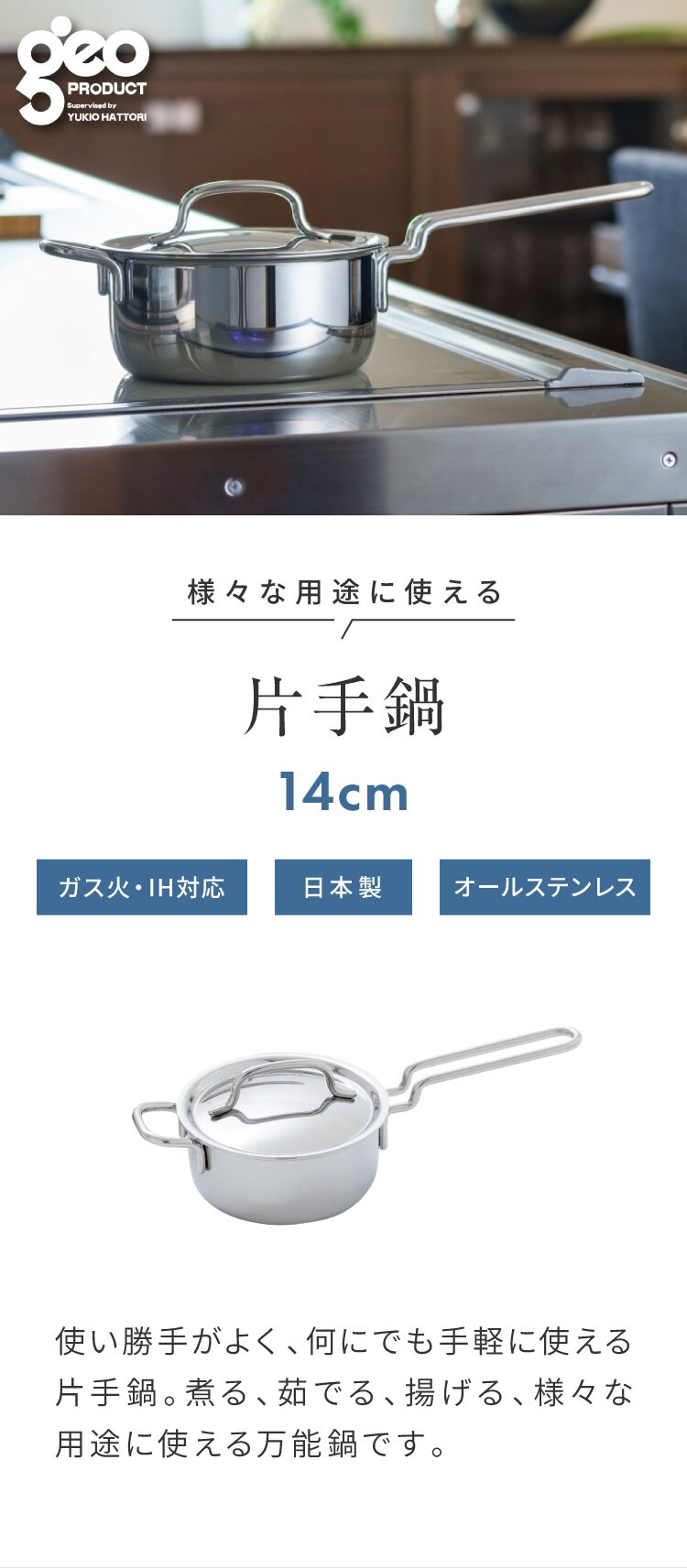ジオ・プロダクト 日本製 片手鍋 14cm GEO-14N ガス火・IH対応 オーブン可 GEO ジオ 服部幸應先生 国産 宮崎製作所 Miyaco ジオプロダクト【送料無料】