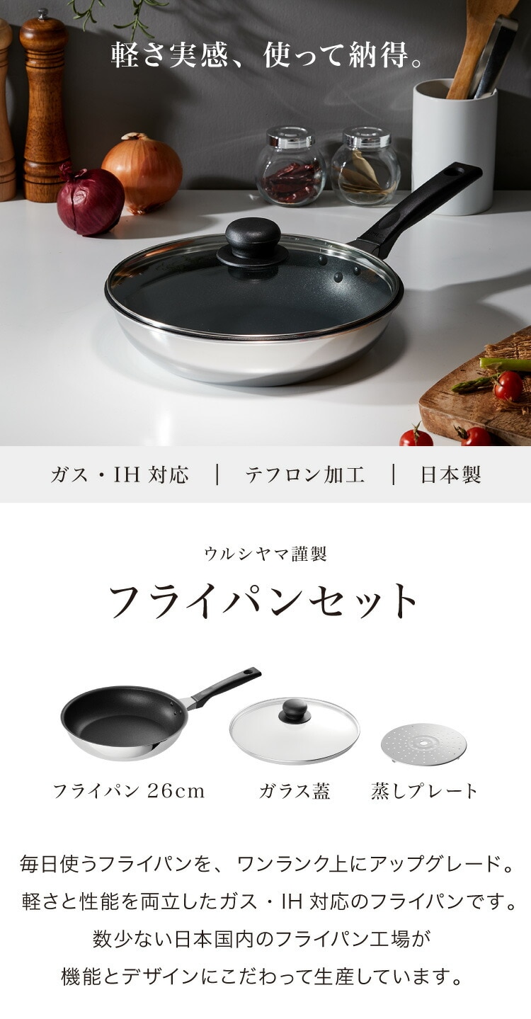 【当店限定!ガラス蓋&蒸しプレート付き3点セット】 日本製 ウルシヤマ謹製 フライパン 26cm IH対応 フタ付き 蒸し器 スチーマー せいろ 蒸しかご ガス火 IH 国産 PFOAフリー【送料無料】