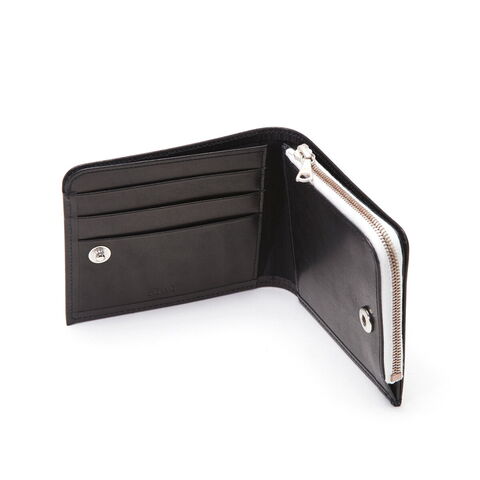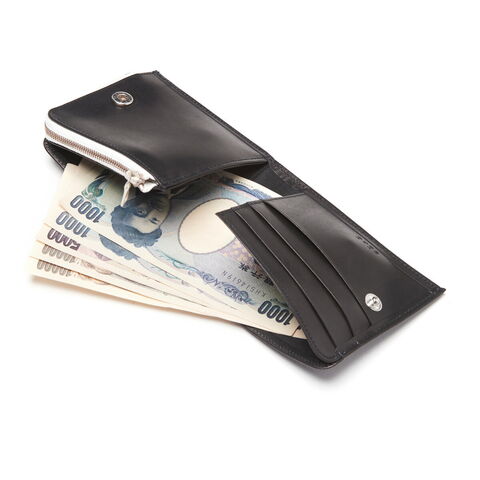 薄型にデザインされた二つ折り財布は、パタパタと開かないようにスナップボタンで留められるよう工夫がなされたアイテム。