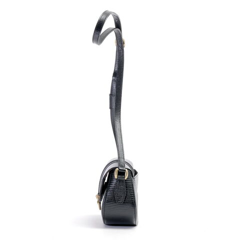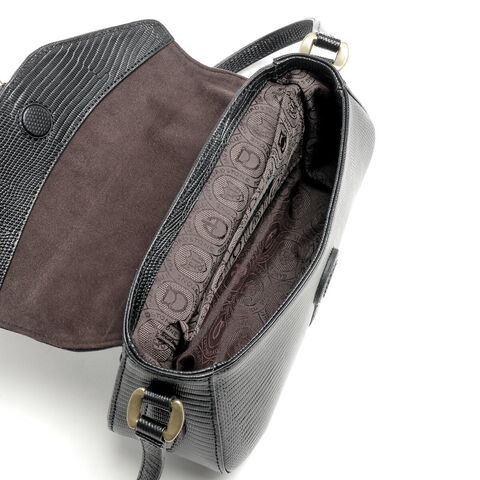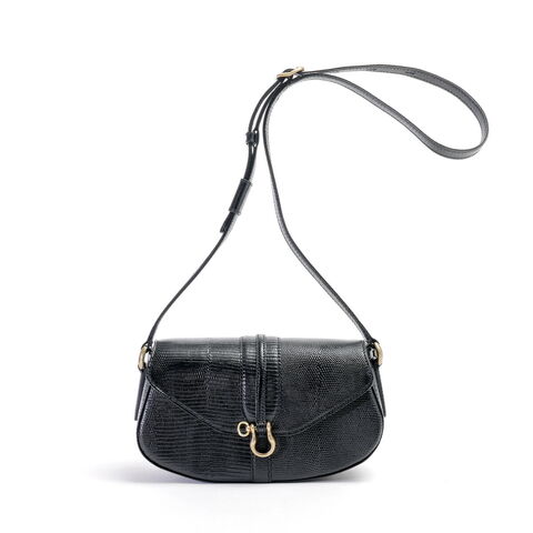クラシカルなフラップデザインを取り入れたショルダーバッグは、リザード型押しレザーが醸し出すリュクスな雰囲気が魅力です。
