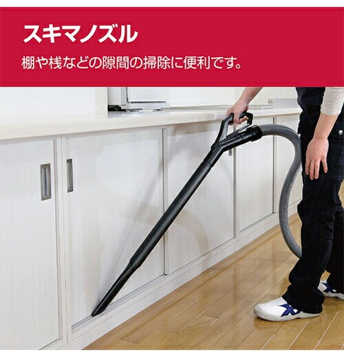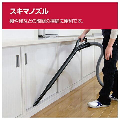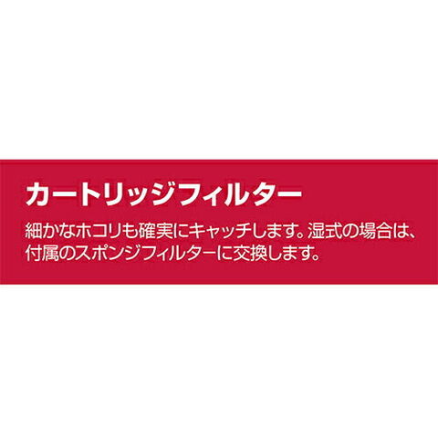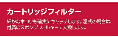 ●付属品:ホース(内径28×長さ1.8m)・カートリッジフィルタ(本体取付)・フィルタロック(本体取付)・湿式用スポンジフィルタ・延長管・床ブラシ・スキマノズル・肩掛けバンド・ジョイントハンドル・パイプアダプタ・コードフック。
