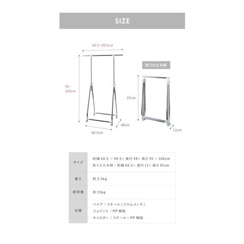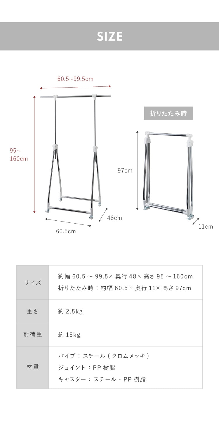 素材:パイプ:スチール(クロムメッキ)、ジョイント:PP樹脂、キャスター:スチール・PP樹脂