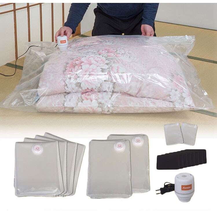 ファミラ 掃除機のいらない布団圧縮袋 吸引機+圧縮袋 15点セット 掃除機いらずで簡単圧縮 吸引&圧縮 密封チャック 竹炭シート ふとん圧縮袋 布団圧縮袋 押入れ 押し入れ 収納 衣類収納【送料無料】