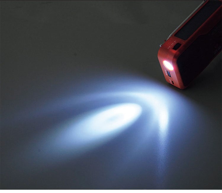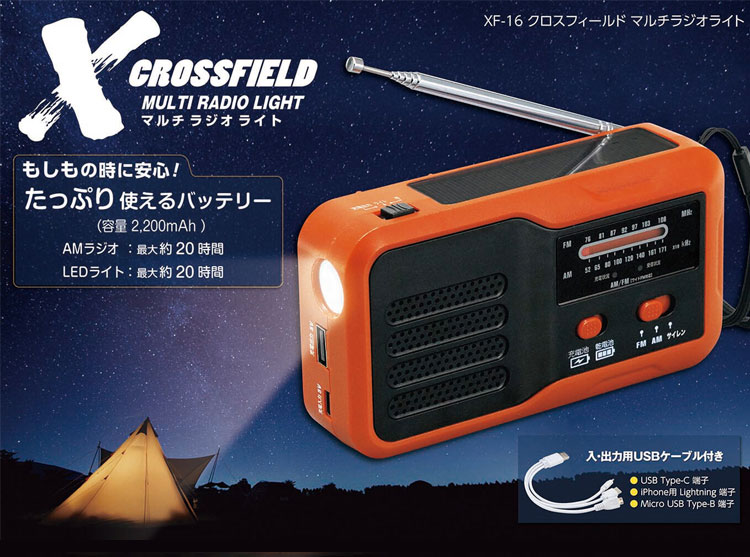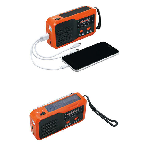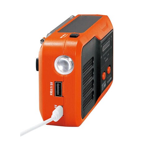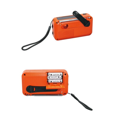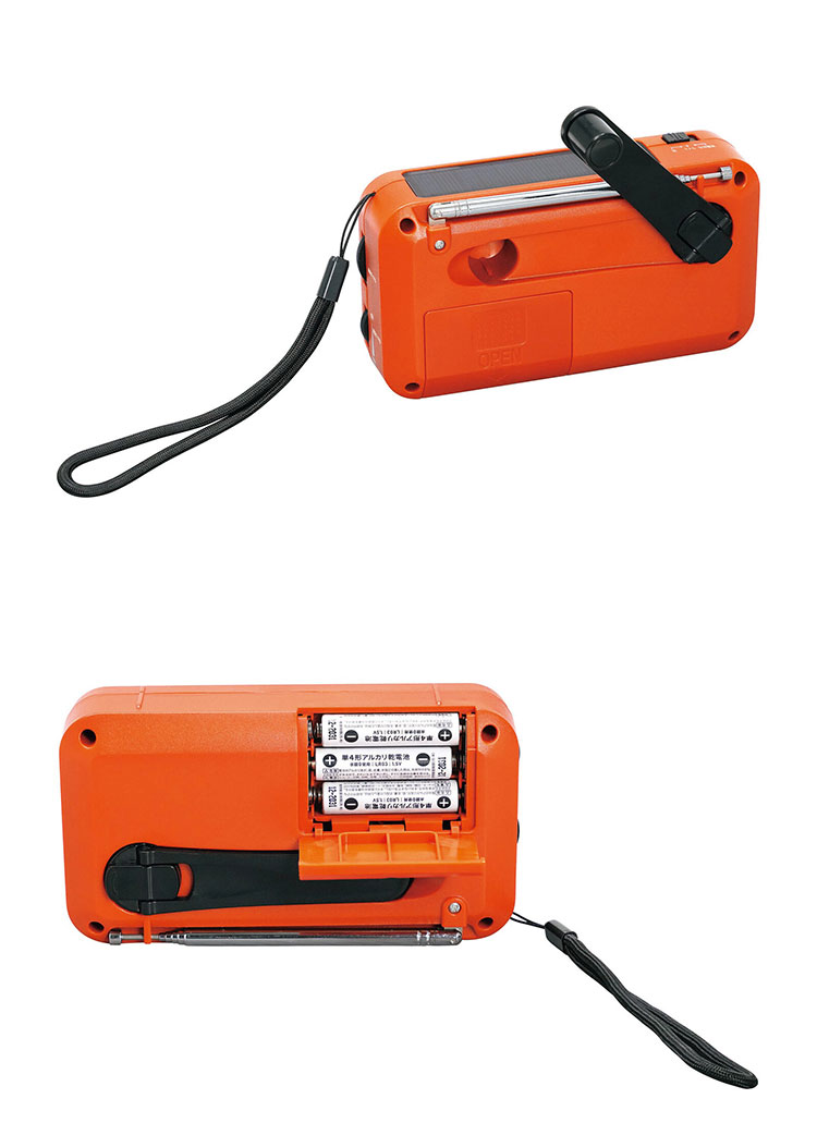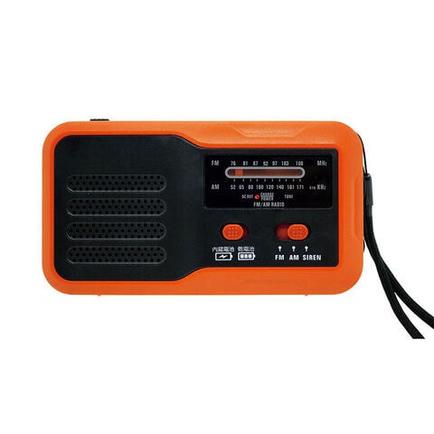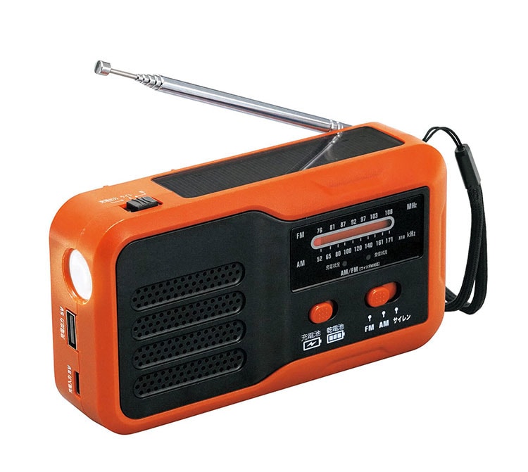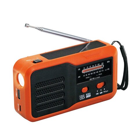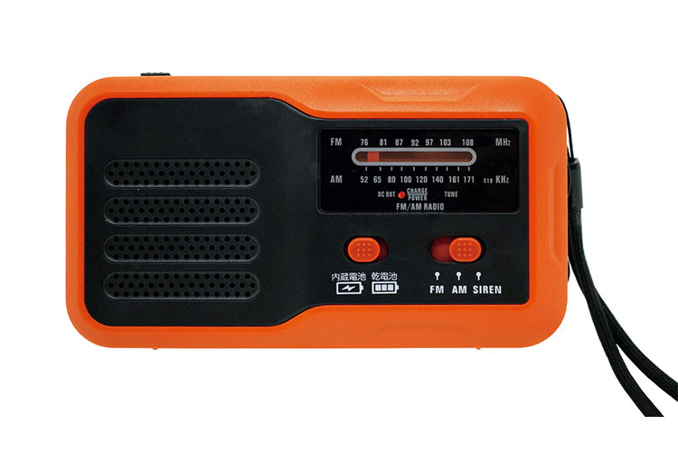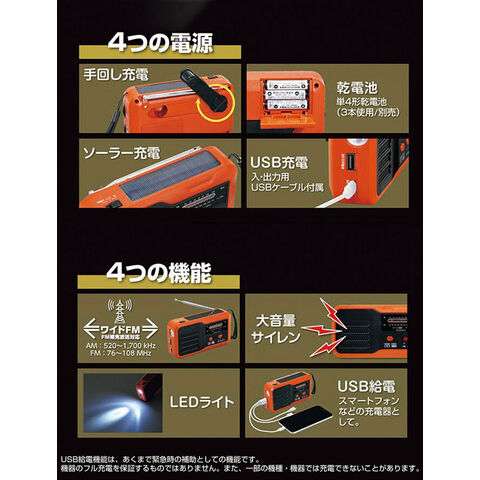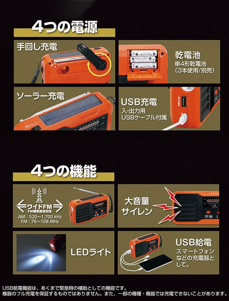 4つの機能:AM/ワイドFM、LEDライト、大音量サイレン、USB給電