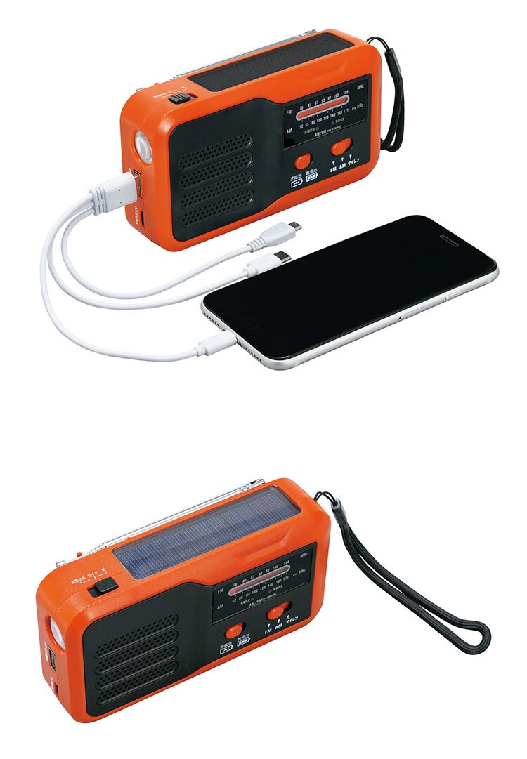 LEDライト、AM・FMラジオ(ワイドFM対応)、大音量サイレン、ソーラー充電、手回し充電