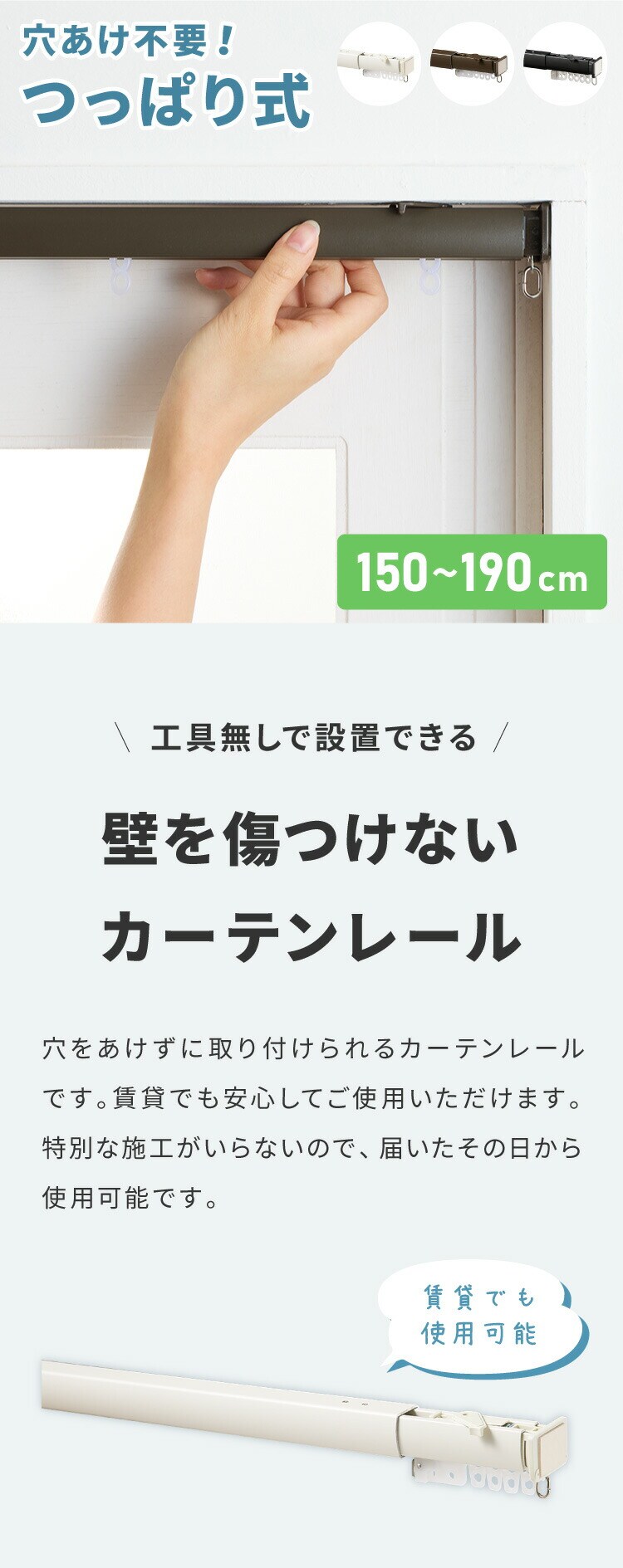 【新色ブラック追加】 カーテンレール 190cm つっぱり 賃貸 フィットワン 伸縮 シングル 穴あけ不要 取付簡単 間仕切り 突っ張り ねじ不要 伸縮レール テンション 1.9m シンプル おしゃれ ブラック ホワイト ブラウン【送料無料】
