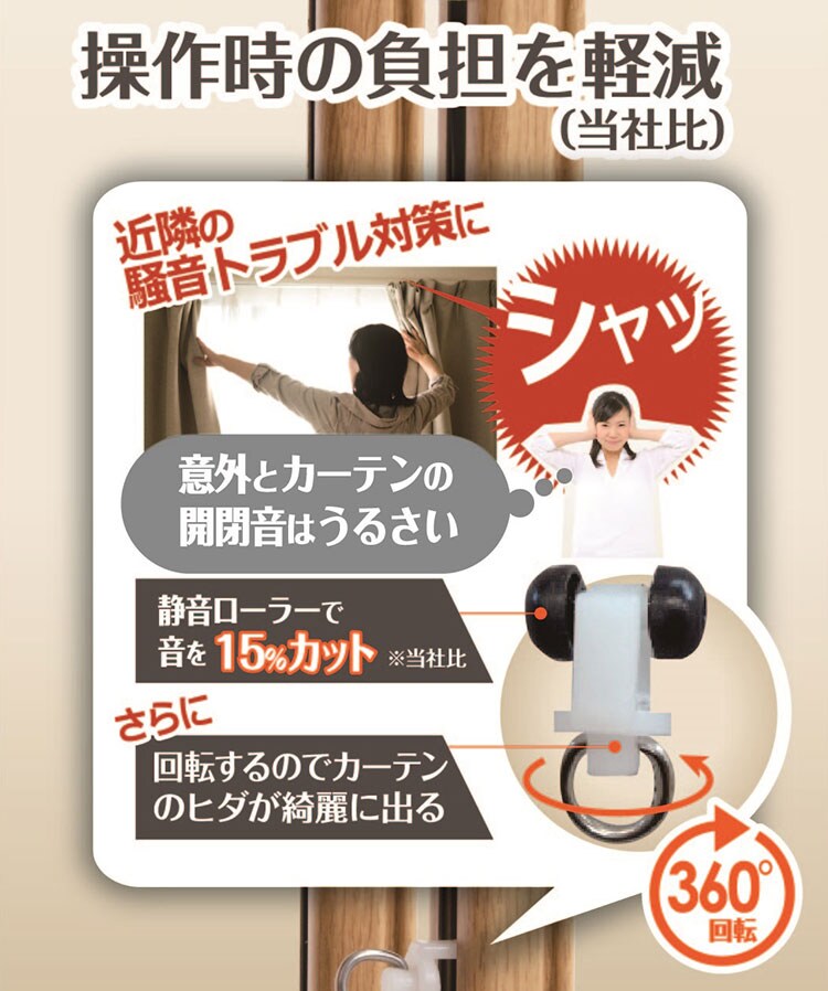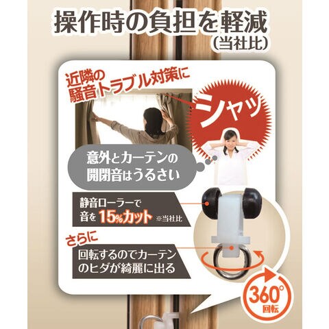 静音タイプのカーテンレール。静音ローラーで音を約15%カット(当社比)ドライバー1本で簡単に取付ができます。