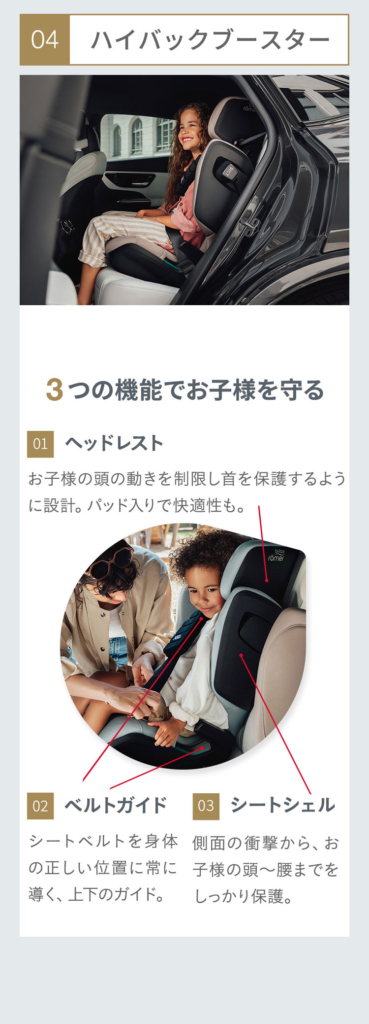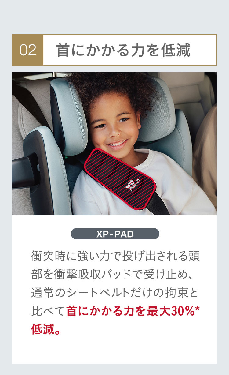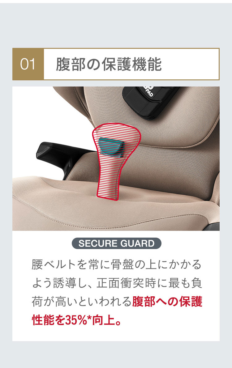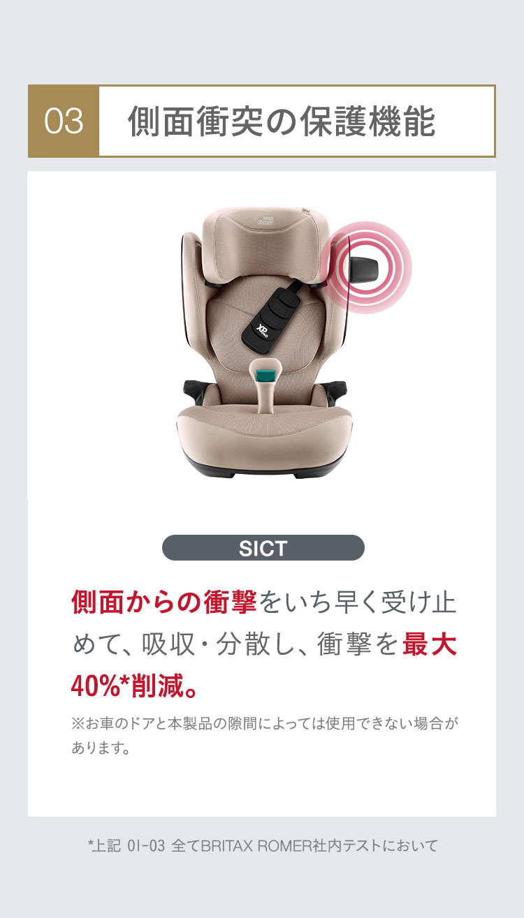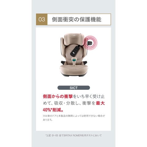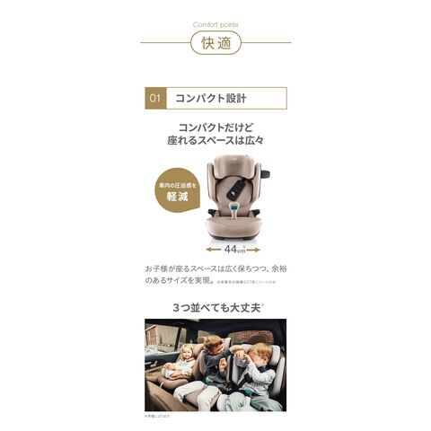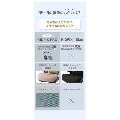 独自開発の安全機能を搭載した「 KIDFIXPRO I-SIZE 」は、3歳半から12歳までのお子様を快適かつ安全にサポートします。