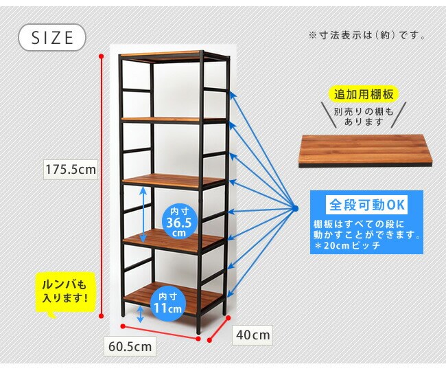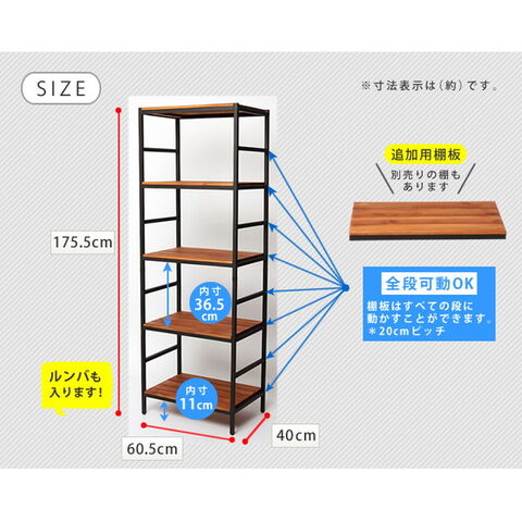 | ■サイズ | 本体:幅 約605×奥行 約400×高さ 約1755mm 棚取り付け穴:約200mm間隔(左右各9箇所) |
