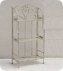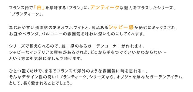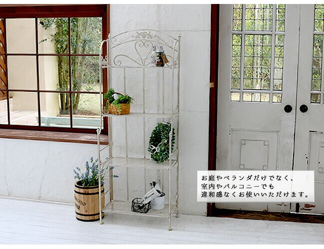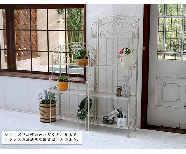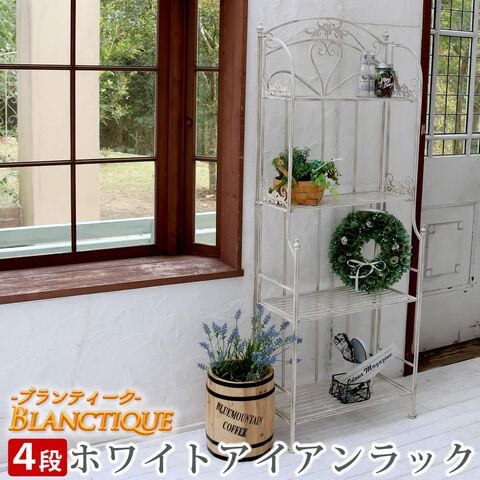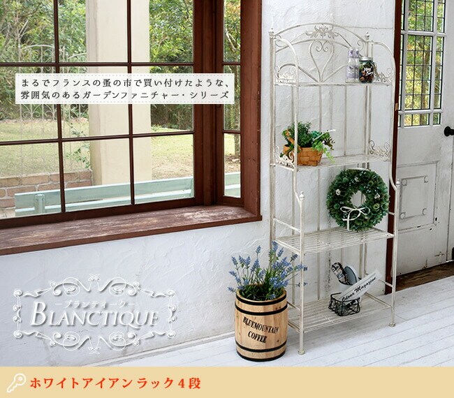 【ブランティーク ホワイトアイアンラック 4段】まるでフランスの蚤の市で買い付けたような、雰囲気のあるガーデンファニチャー・シリーズあたたかな気持ちにさせてくれるフレンチ・アンティークフランス語で「白」を意味する「ブラン」に、アンティークな魅力をプラスしたシリーズ、「ブランティーク」。なじみやすい清潔感のあるオフホワイトと、気品あるシャビー感が絶妙にミックスされ、お庭やベランダ、バルコニーの雰囲気を味わい深いものにしてくれます。シリーズで揃えられるので、統一感のあるガーデンコーナーが作れます。シャビーなインテリアに興味があるけれど、どこから手をつけていいかわからない・・・という方にも気軽に楽しんで頂けます。ひとつ置くだけで、まるでフランスの郊外のような雰囲気に時を忘れる・・・。そんなデザイン性の高い「ブランティーク」シリーズなら、オブジェを兼ねたガーデンアイテムとして長く愛されることでしょう。