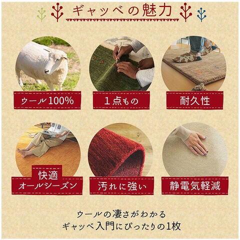 鮮やかな色合いと素朴な風合いが魅力的!なめらかな肌触りと程よいボリューム感の天然羊毛インド製手織りギャッベ。