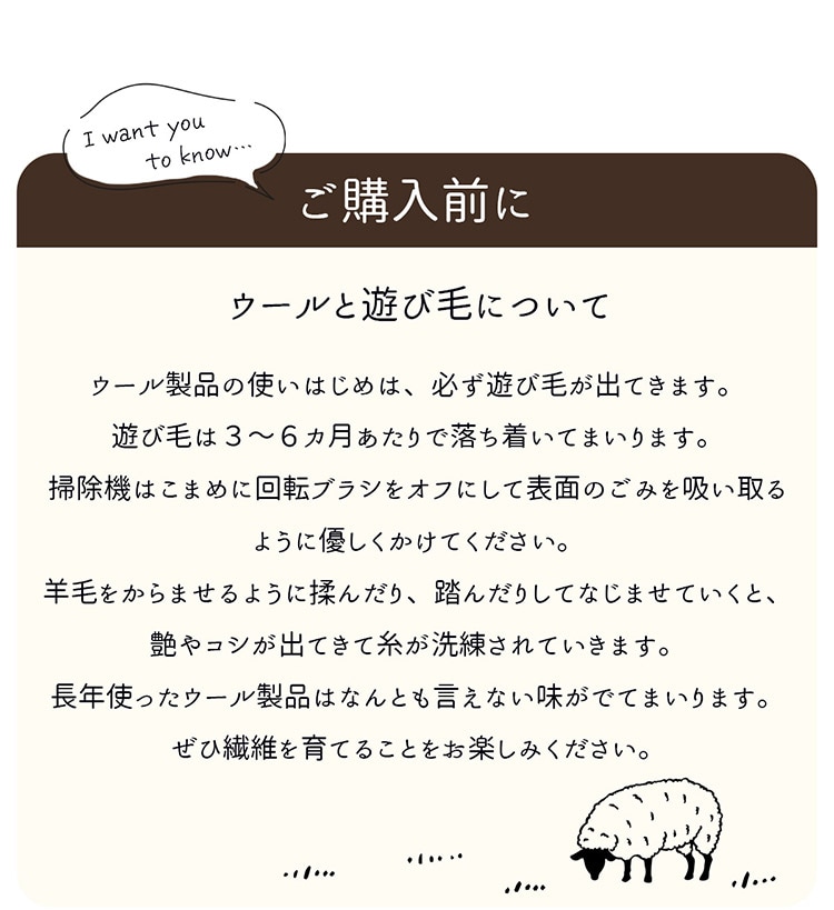 ※ウール製品のため遊び毛がでます。掃除機をお使いの場合は回転ブラシをオフして優しく吸い込んでください。