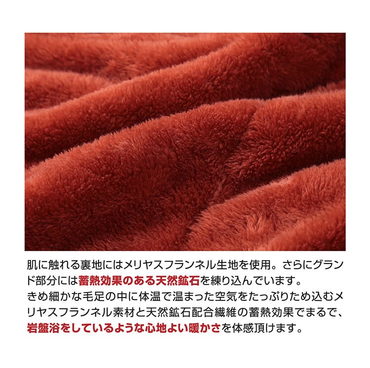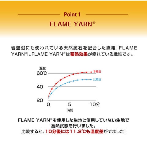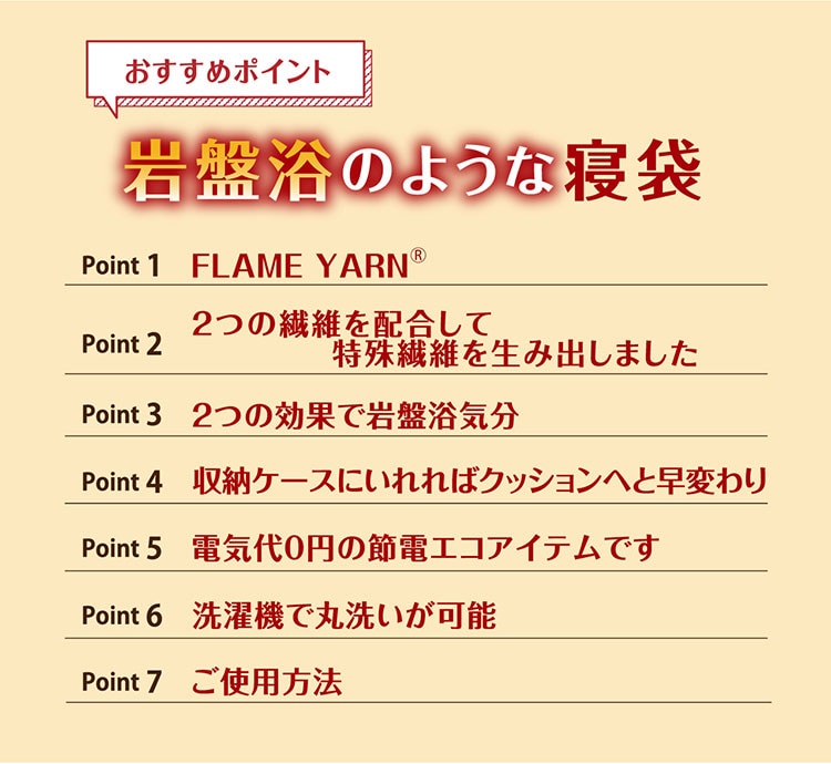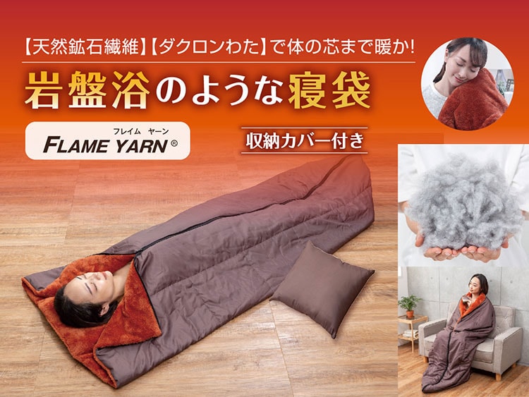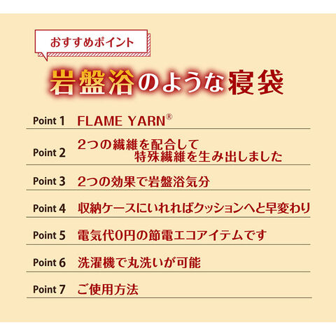 寝袋の内側(肌に触れる方)のあたたかい素材には岩盤浴にも使われている天然鉱石を配合した繊維「FLAME YARN(R) 」を生地の基布部分に使用しています。