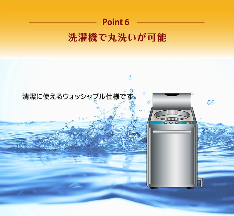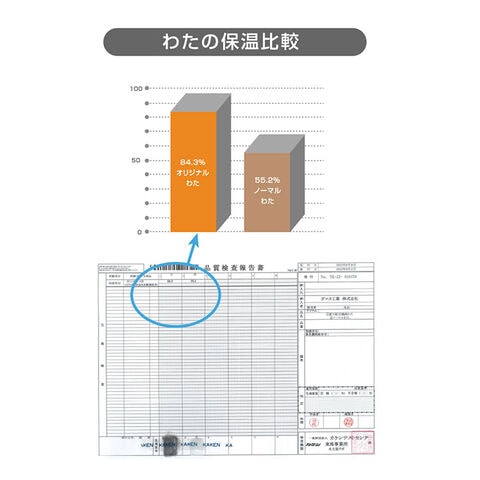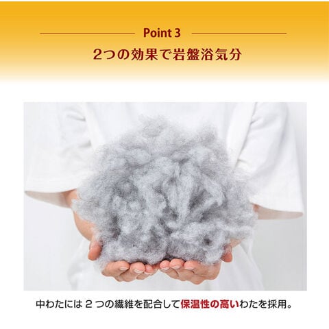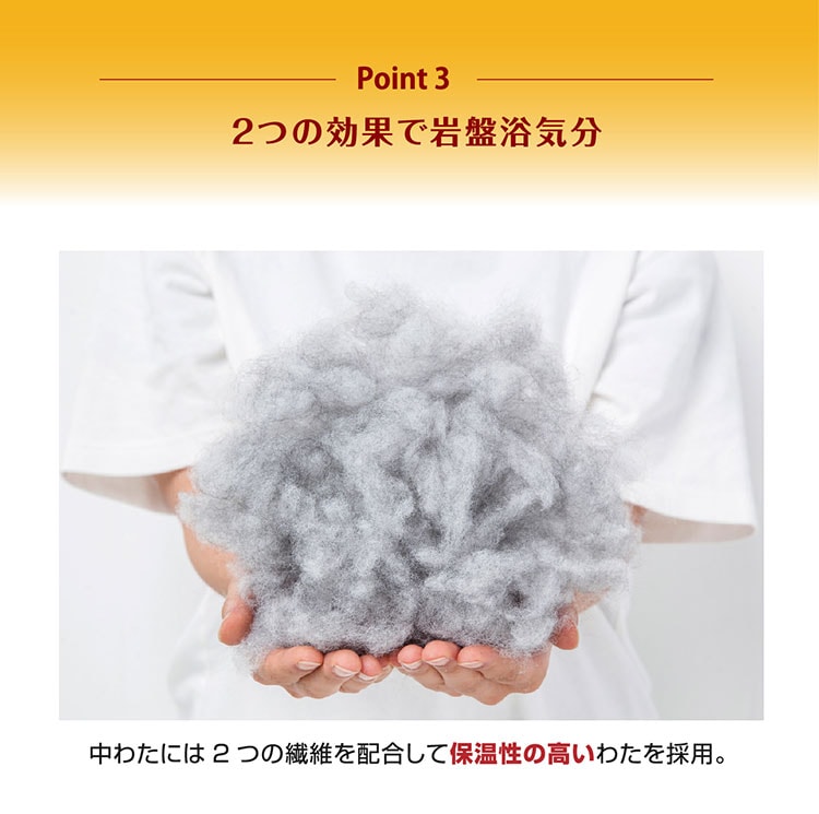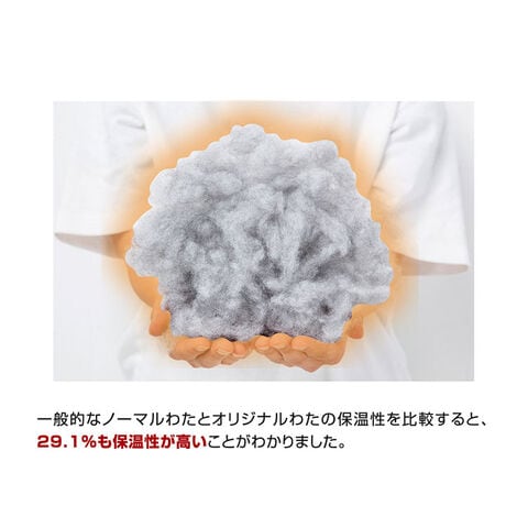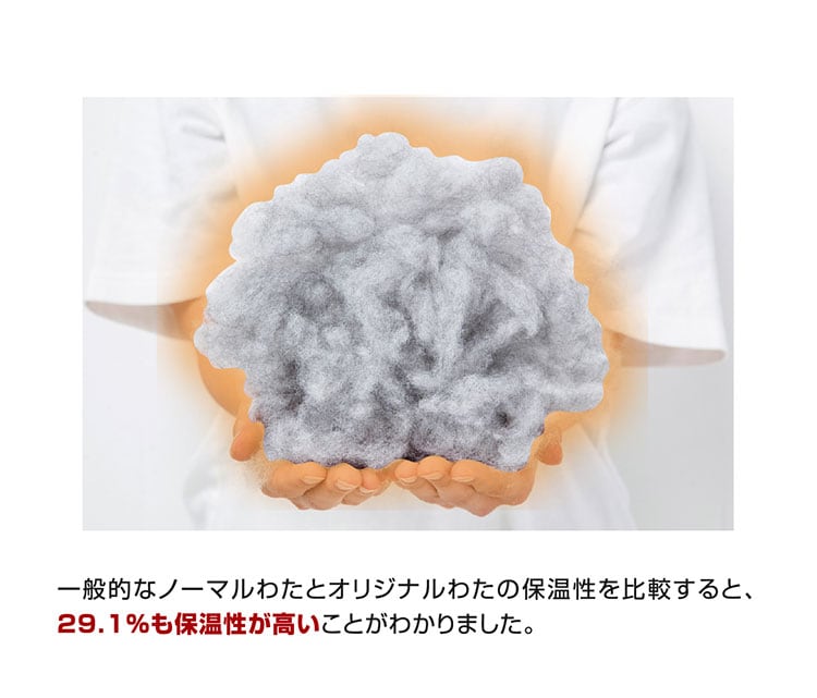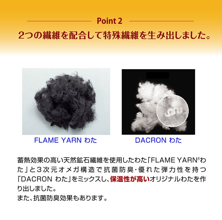 中わたには蓄熱効果の高い天然鉱石配合繊維と3次元オメガ構造で抗菌防臭と優れた弾力性を持つ「DACRONわた」をミックスした、独自開発の保温性が高いわたを使用しました。