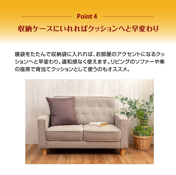 寝袋は使い方もいろいろ。車中泊や車の中で。アウトドアで。おうちでブランケット代わりに。掛布団として。防災用の備えにも役立ちます。老舗寝具メーカーの知識を詰め込んだ寝袋です。