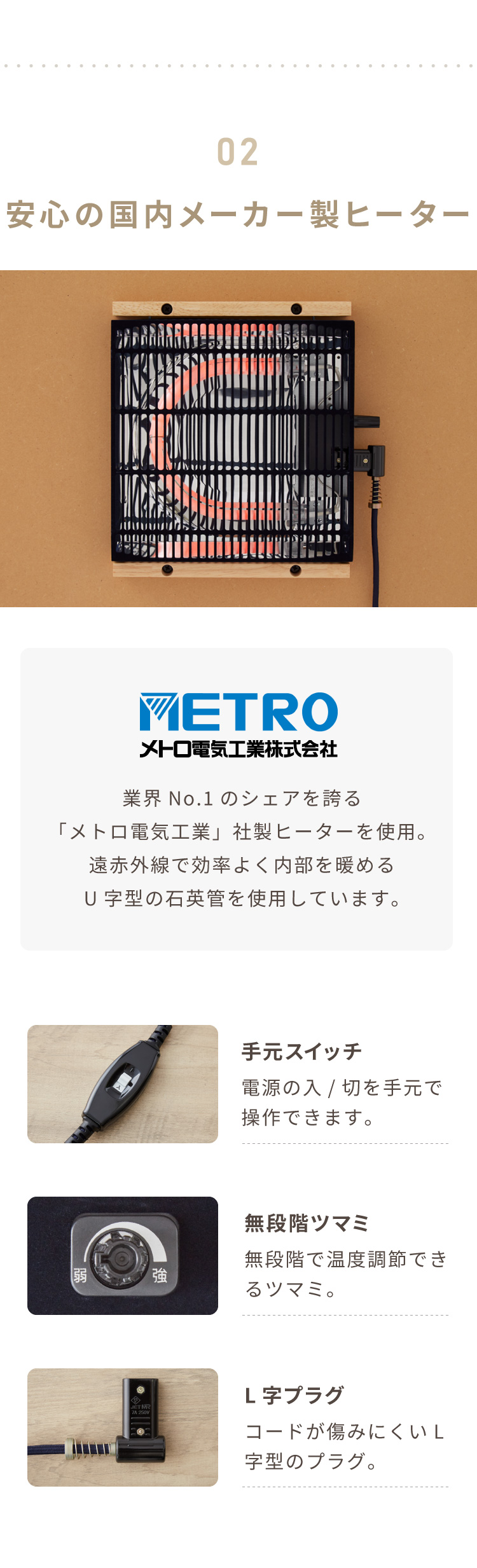 ・ヒーターには、国内メーカーの「メトロ電気工業」製の石英管ヒーターを採用。