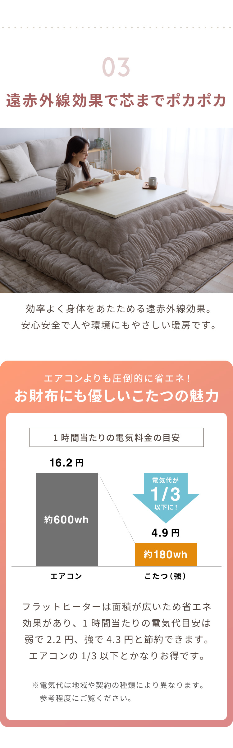 ・ヒーターはフラットヒーターを使用しているので、ヒーターが2.8cmと薄く、脚と干渉しにくい