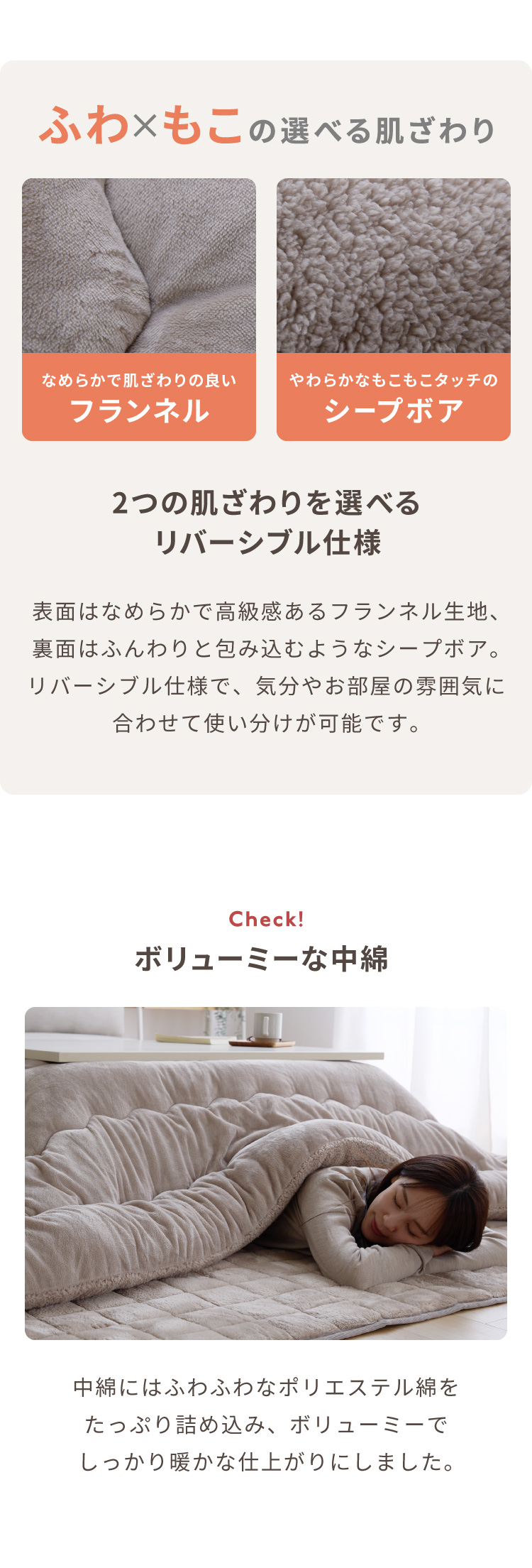 ・こたつ布団はリバーシブルで使え、かつ中綿が2.5kg入っているのでまるでお布団被っているような感覚
