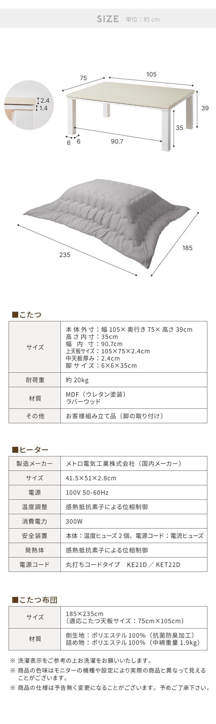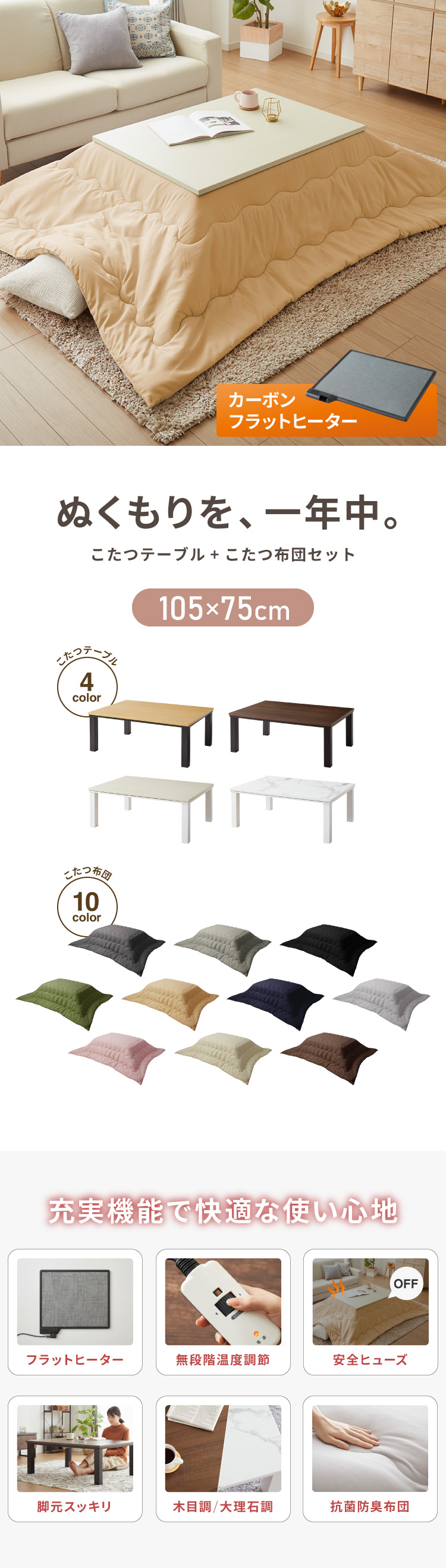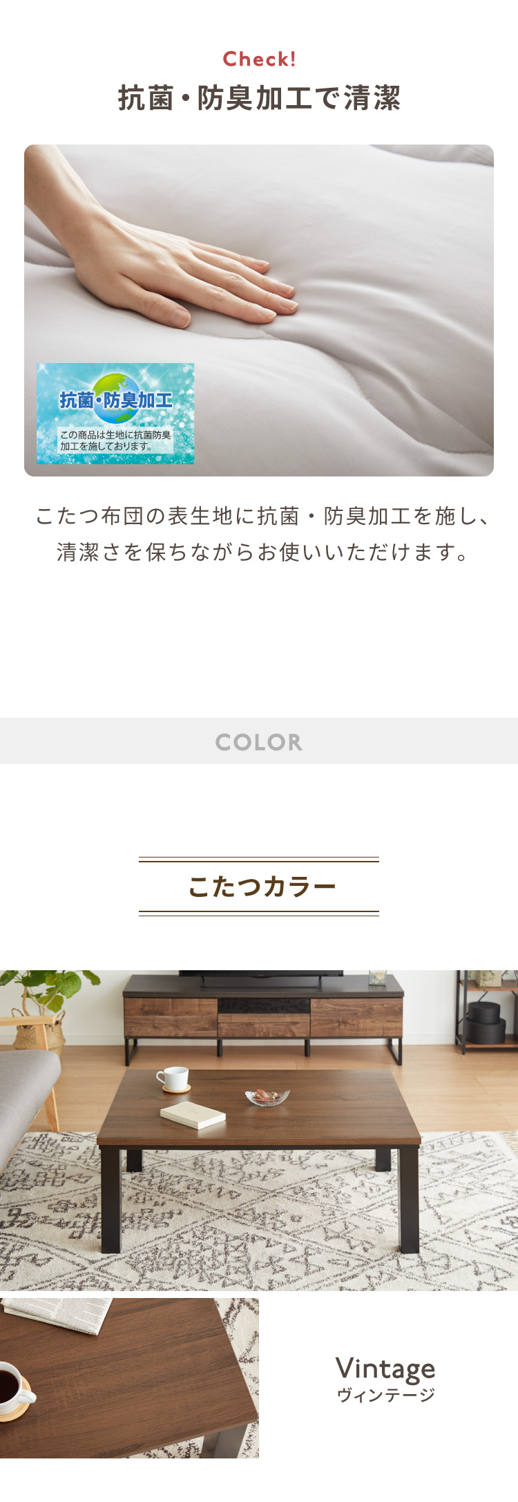 ヴィンテージこたつ 木目ホワイト 105×75cm フラットヒーター こたつ布団セット 選べる10色 こたつテーブル 長方形 こたつ テーブル ヴィンテージ こたつ 掛け布団【送料無料】