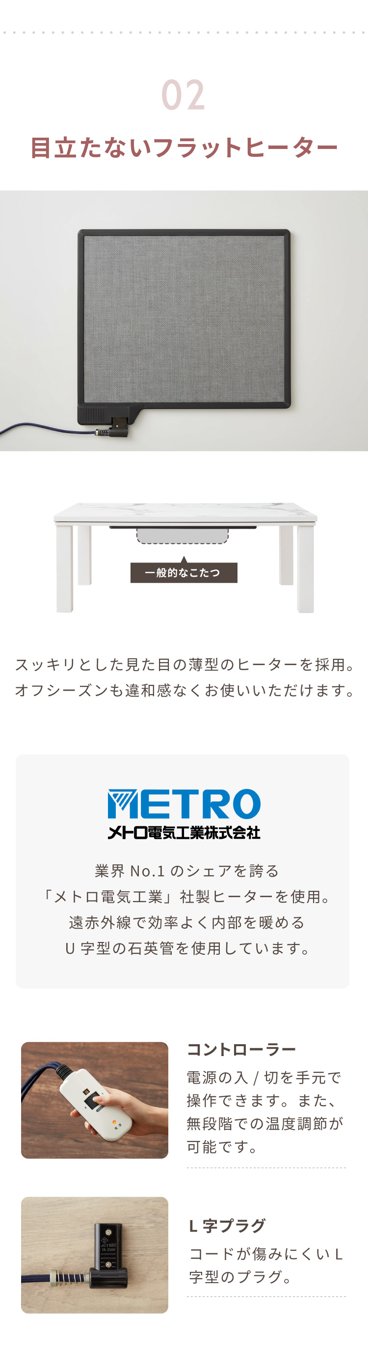 ・ヒーターはフラットヒーターを使用しているので、ヒーターが2.8cmと薄く、脚と干渉しにくい