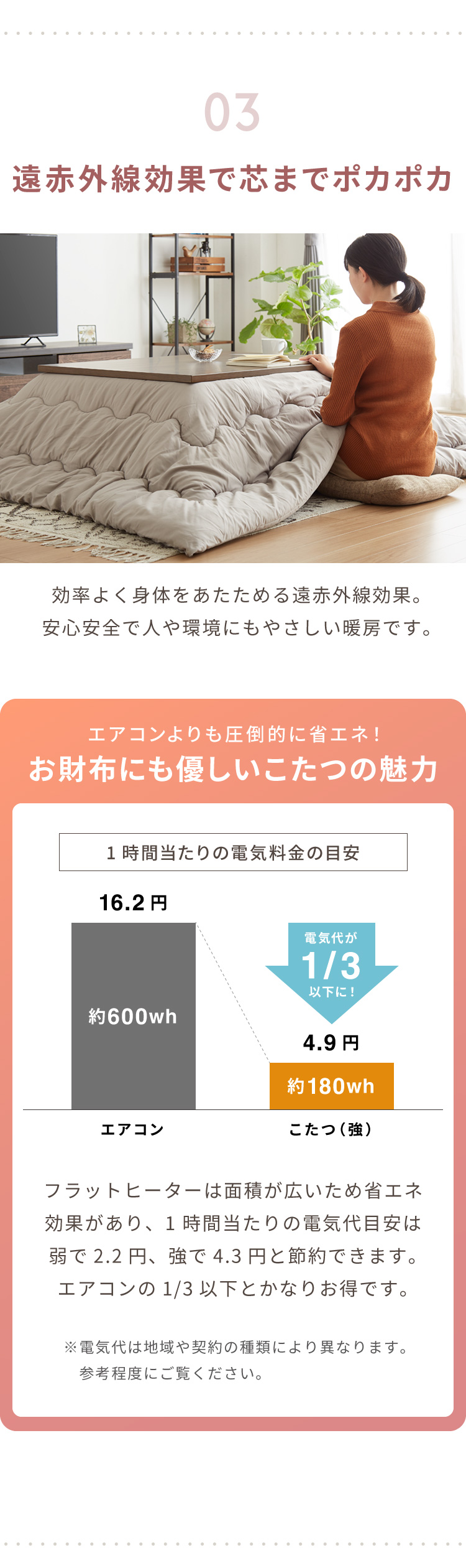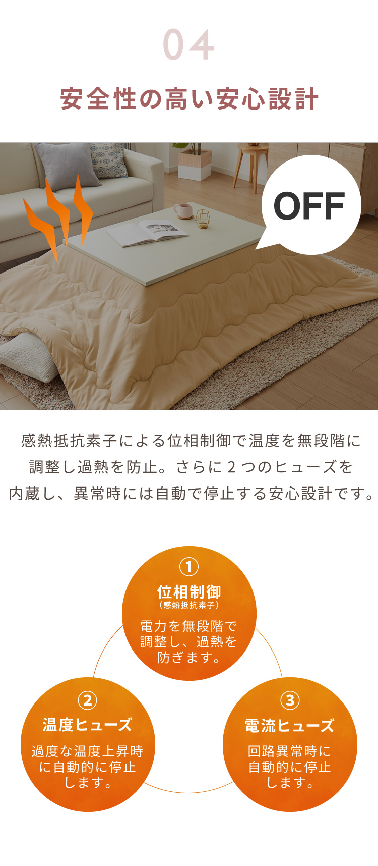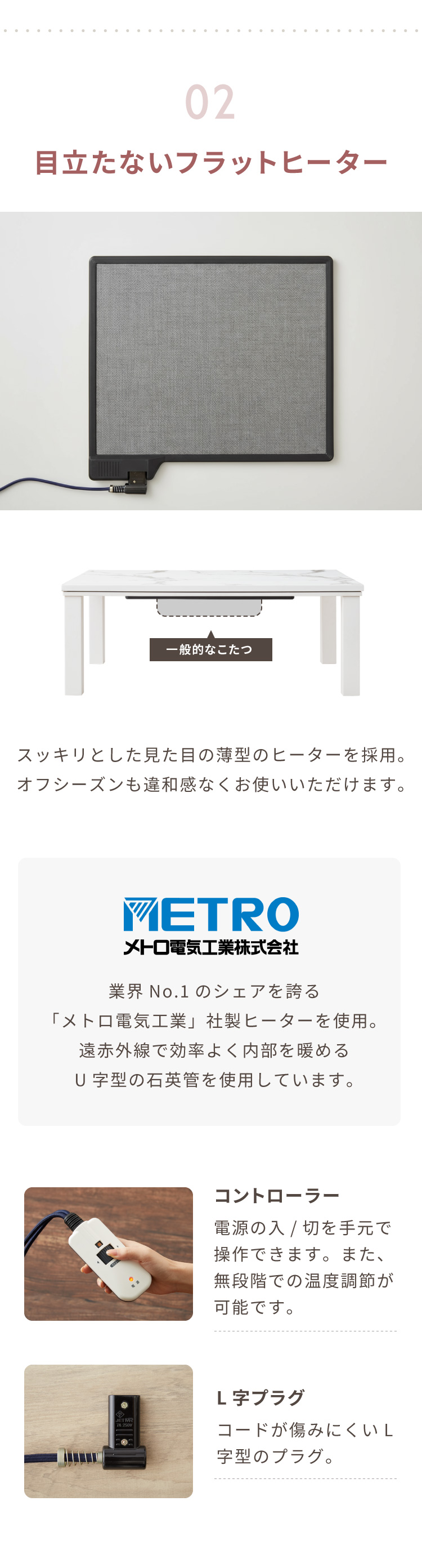 ・ヒーターはフラットヒーターを使用しているので、ヒーターが2.8cmと薄く、脚と干渉しにくい