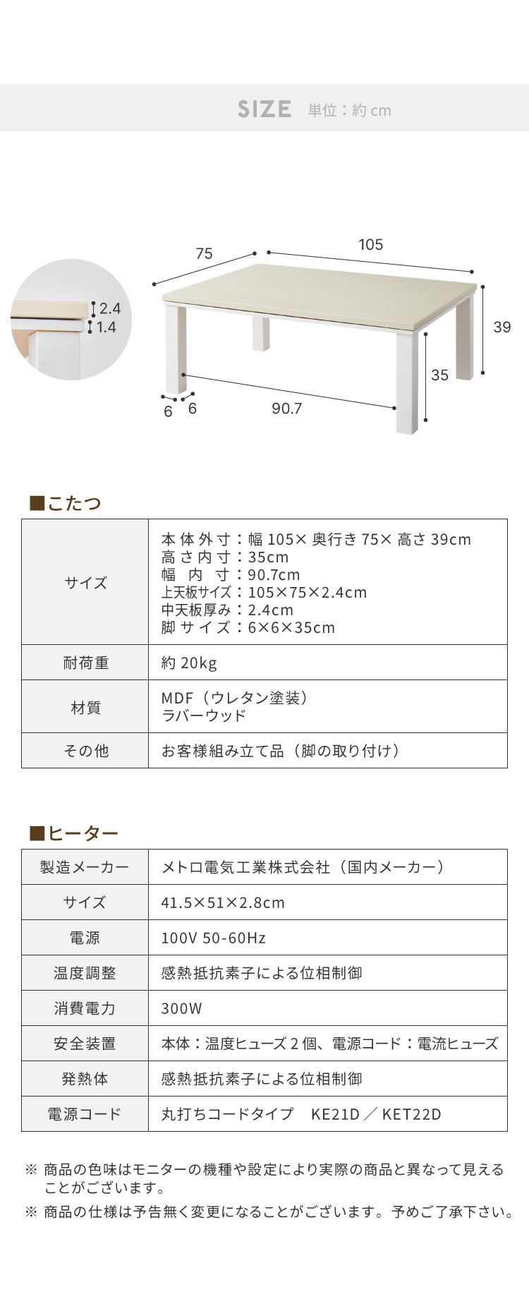 上天板サイズ:幅105×奥行き75cm