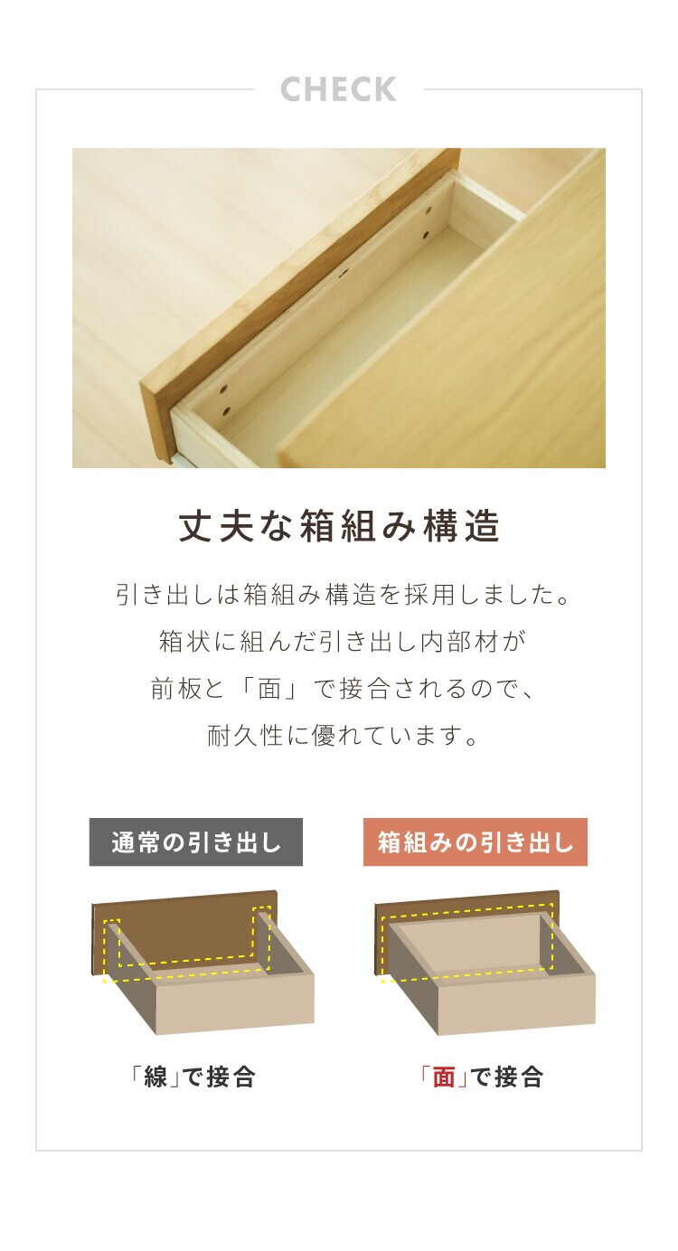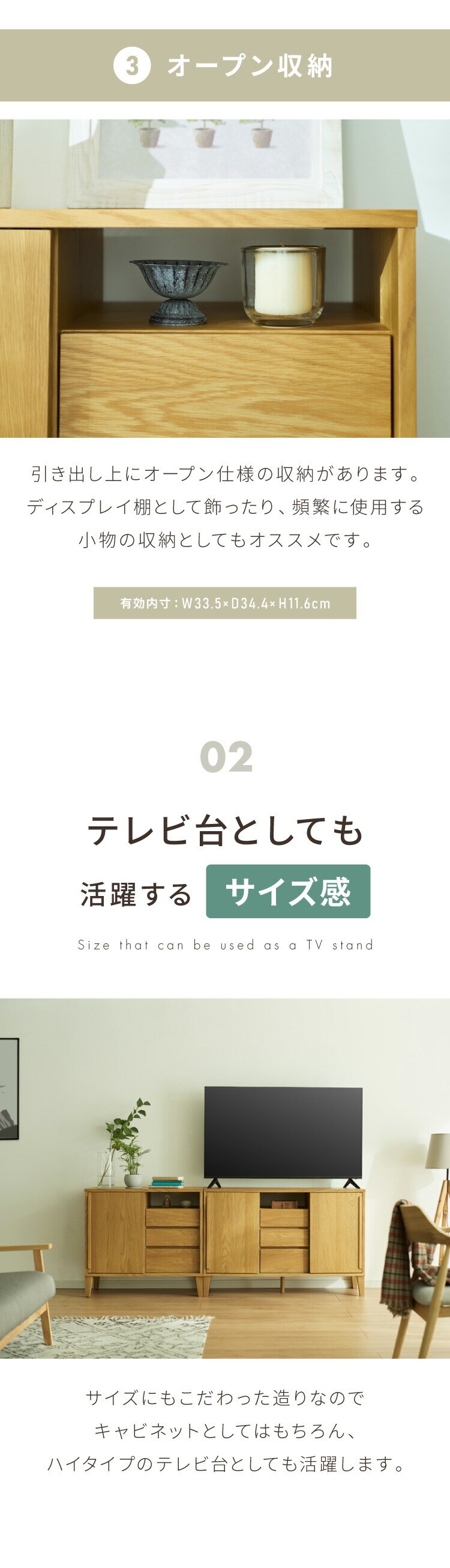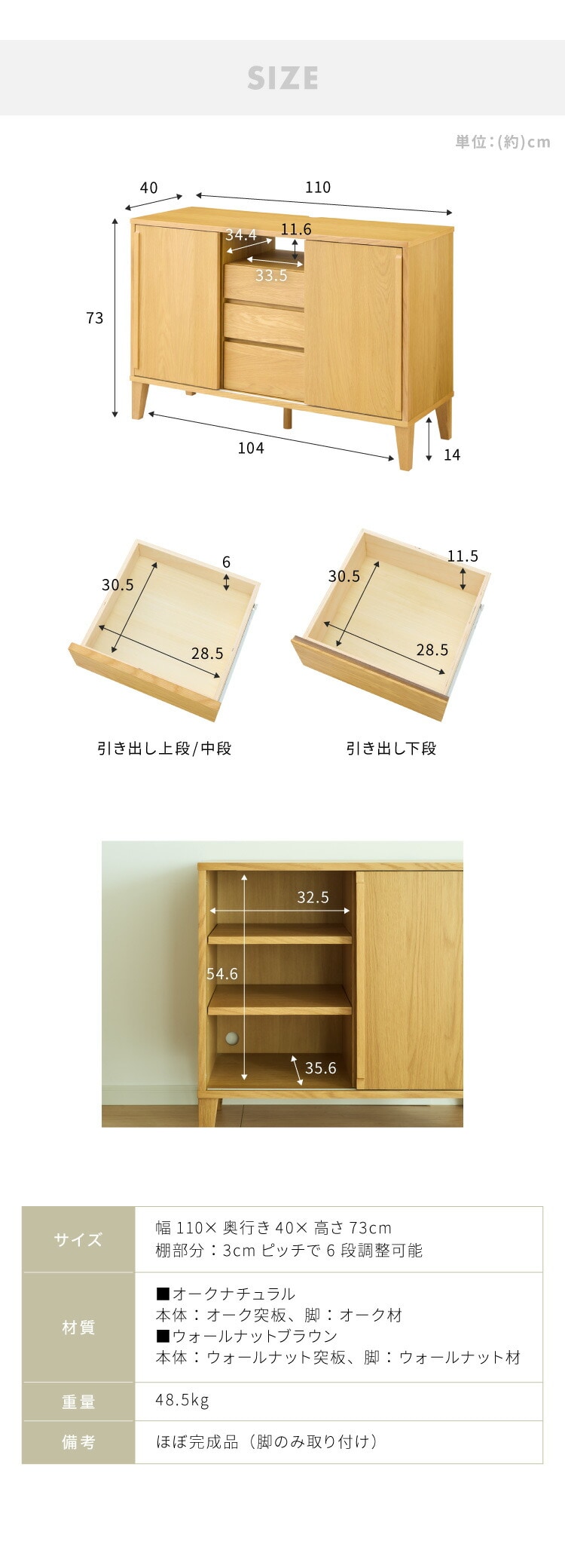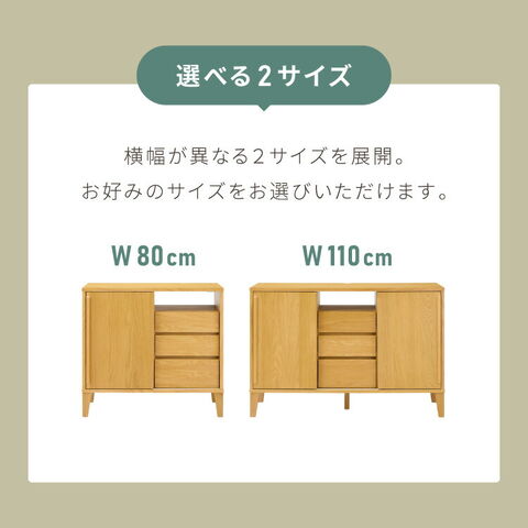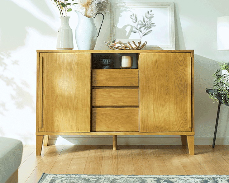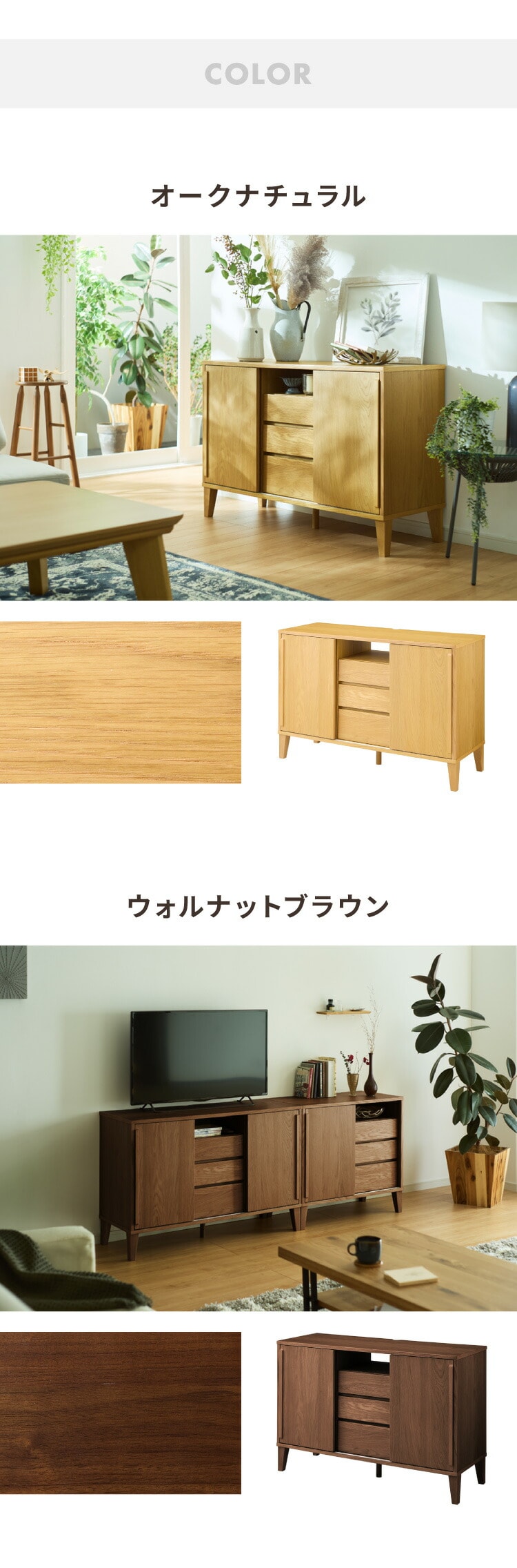 ・ナチュラルにオーク材、ブラウンにウォールナット材を使用しており、木の質感を感じられるキャビネットです。