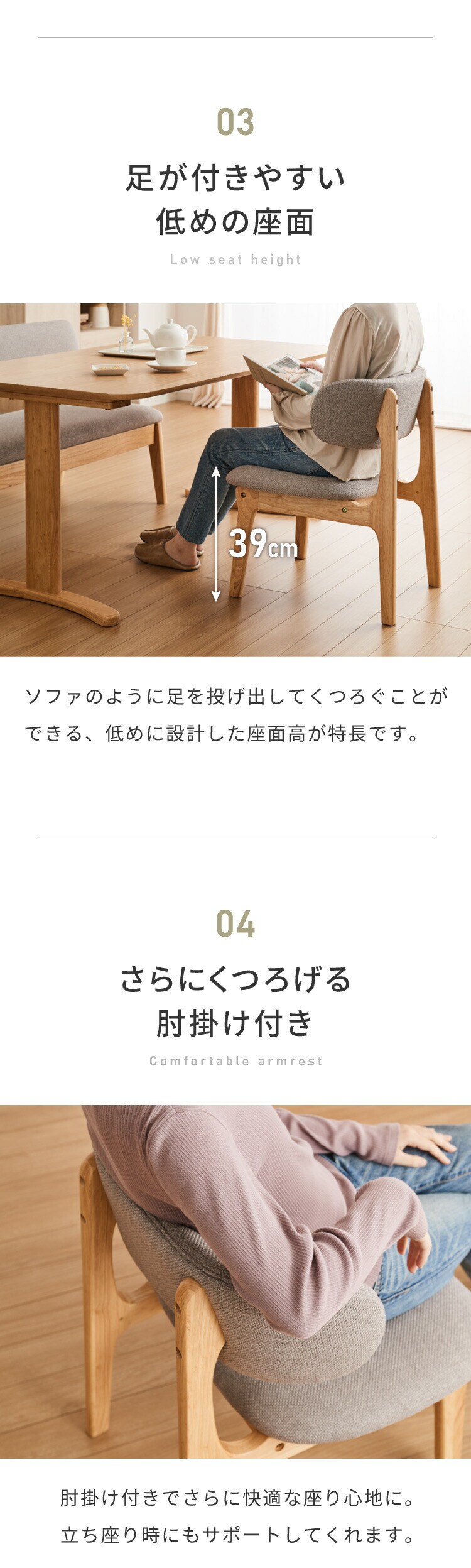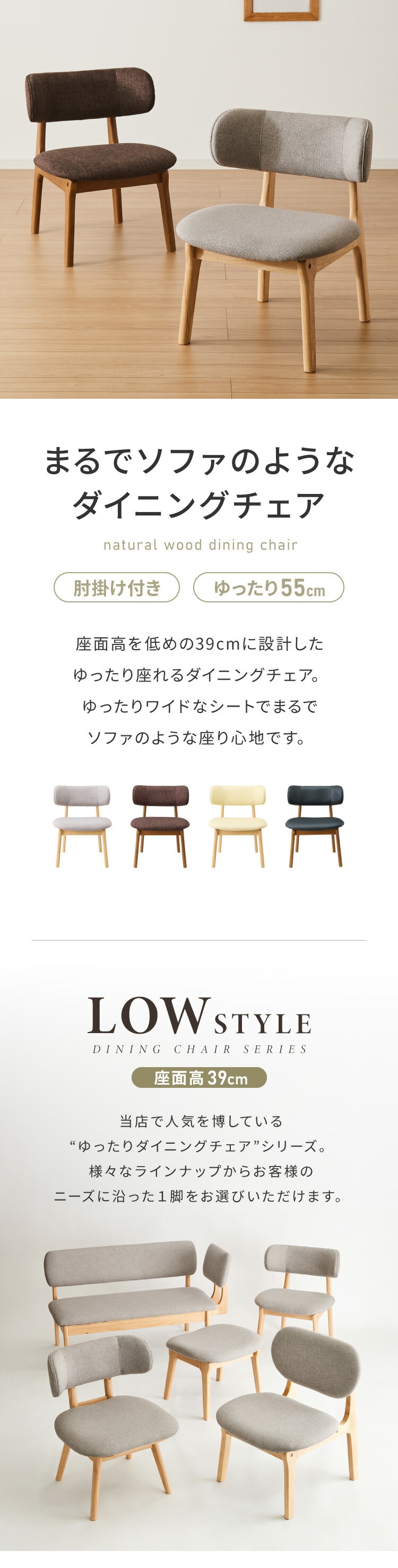 座面高39cm ひじ掛け付き ゆったりダイニングチェア 幅55cm ダイニングチェア お掃除ロボット対応 ロータイプ 天然木 ルンバブル ダイニング チェア パーソナルチェア 1人掛けソファ 椅子 いす イス【送料無料】