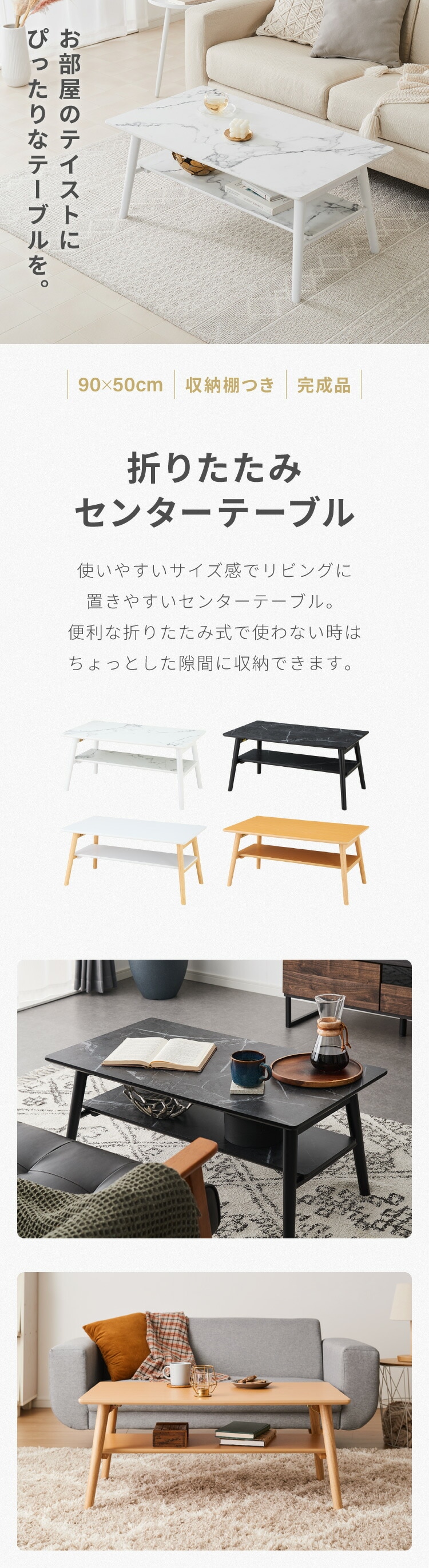 折りたたみ 棚付き センターテーブル 90×50cm ローテーブル おしゃれ 北欧 シンプル ナチュラル センターテーブル ソファテーブル テーブル 大理石 石目調 机 折り畳み 収納付き 天然木 完成品 木製【送料無料】