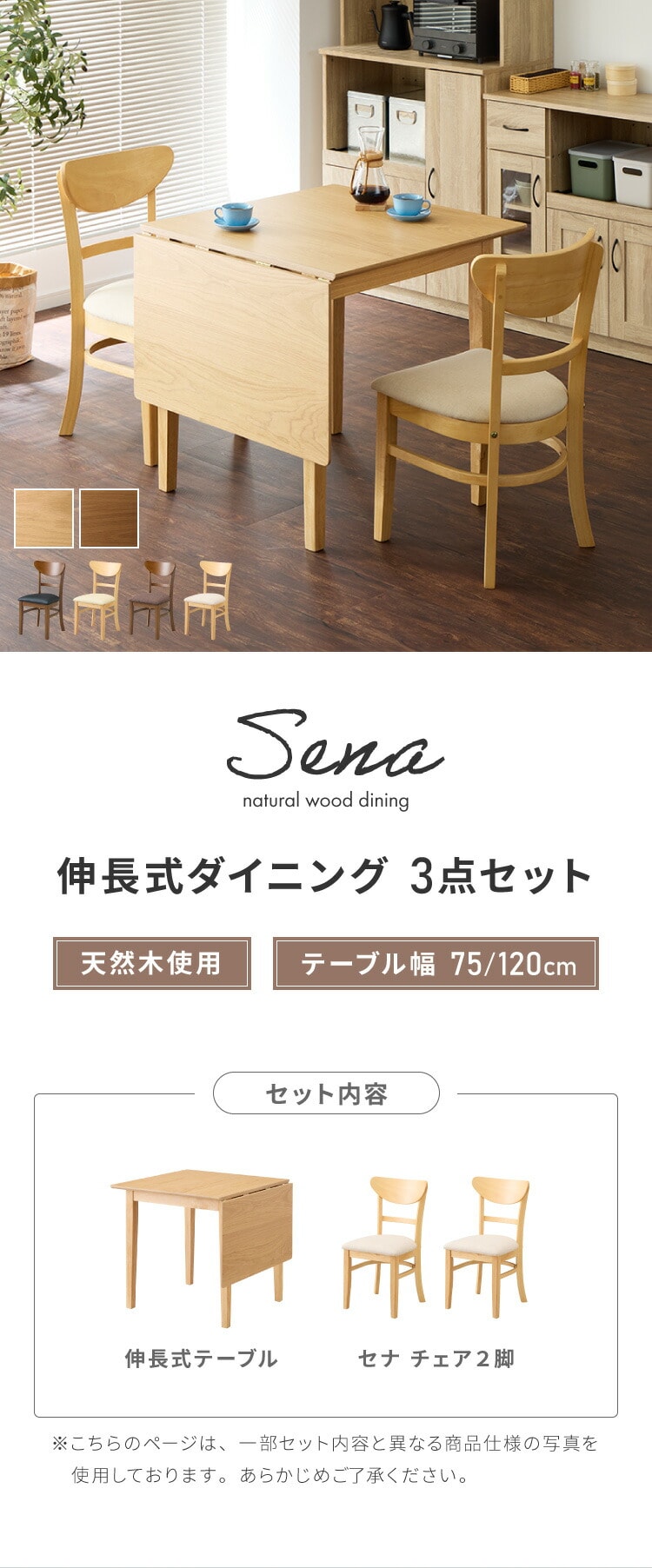伸縮ダイニングテーブル 3点セット 75cm 120cm 天然木 2人掛け 4人掛け ダイニングチェア セナ バタフライテーブル 木製 ダイニングセット 折りたたみ【送料無料】