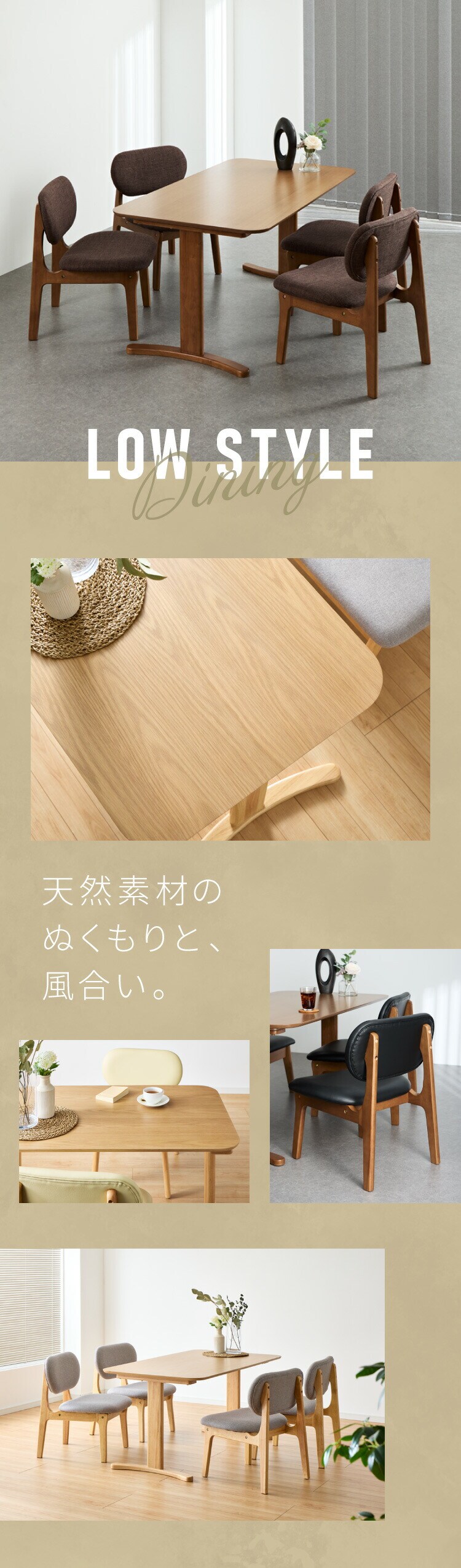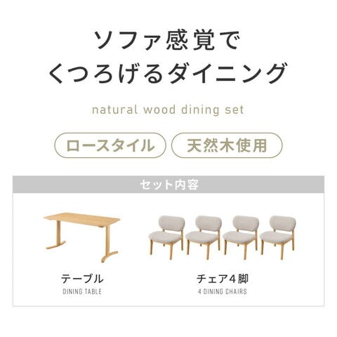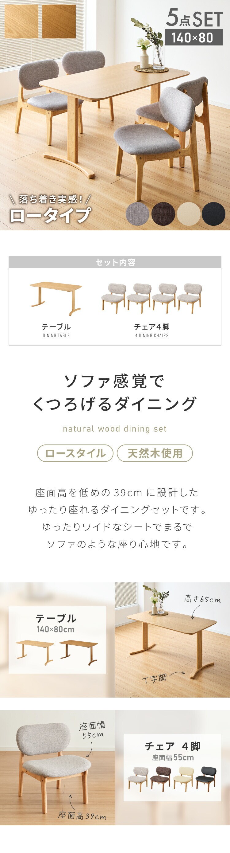 座面高39cm ゆったりダイニングチェア 5点セット 4人掛け 140×80cm ダイニングテーブル 高さ65cm 天然木 オーク突板 ダイニングセット ロータイプ ダイニングチェア ダイニングチェアー ナチュラル【送料無料】