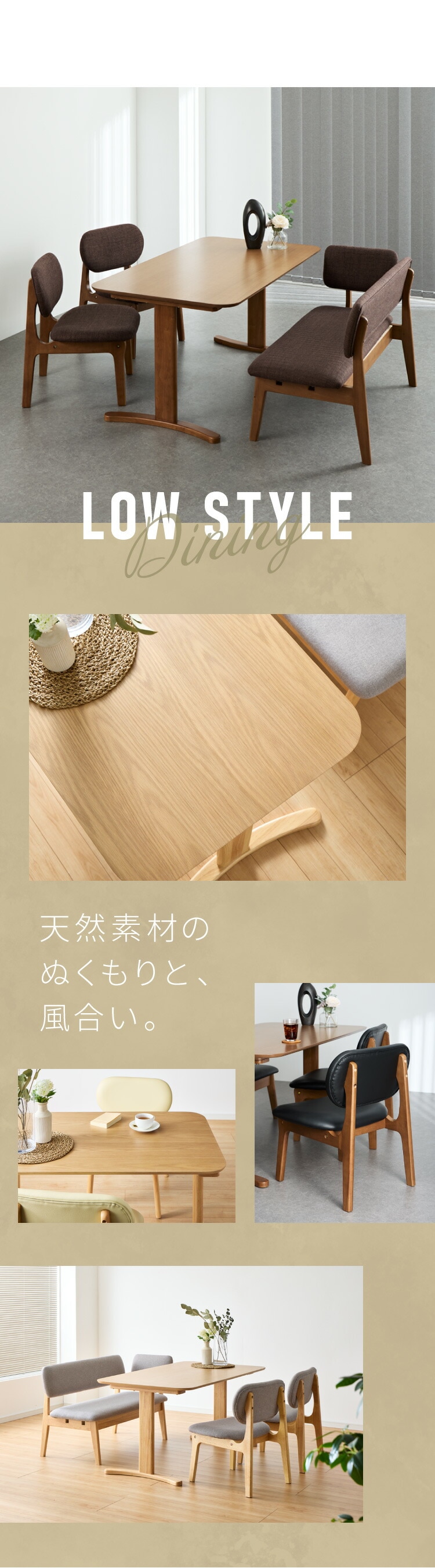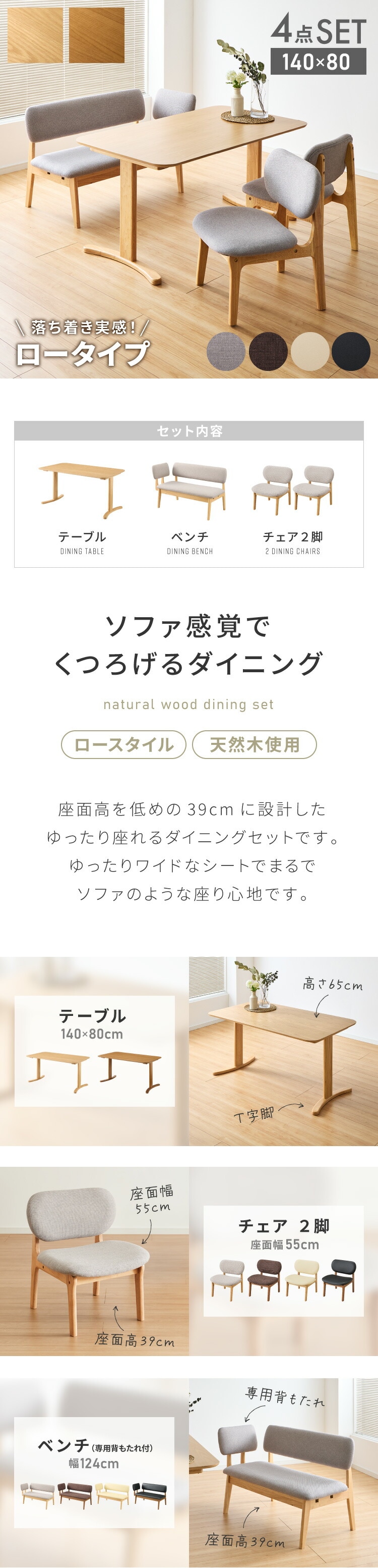 座面高39cm ゆったりダイニングチェア 4点セット 専用背もたれ付き 4人掛け 140×80cm ダイニングテーブル 高さ65cm 天然木 オーク突板 ダイニングセット ロータイプ ダイニングチェア【送料無料】