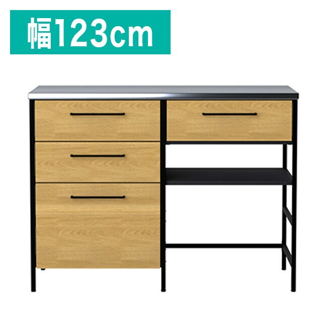 キッチンカウンター ステンレス天板 引き出し ダストカウンター 幅123 奥行48 高さ92 背面化粧 アイアンスチール オーク 天然木 フルオープンレール【送料無料】