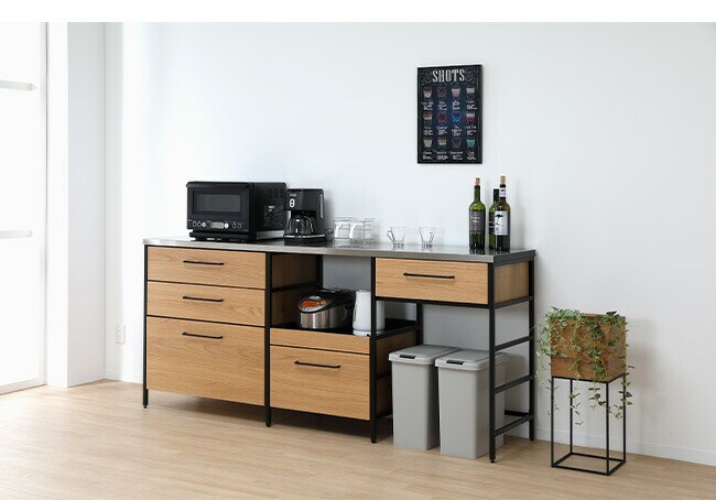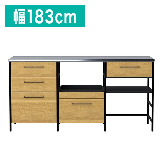 キッチンカウンター ステンレス天板 引き出し スライド棚 ダストカウンター 幅183 奥行48 高さ92 背面化粧 アイアンスチール オーク 天然木 フルオープンレール【送料無料】