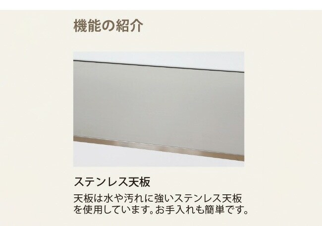 ステンレス天板ですので、水や熱、錆、汚れに強く臭いがつきにくく衛生的です。お手入れも簡単です。