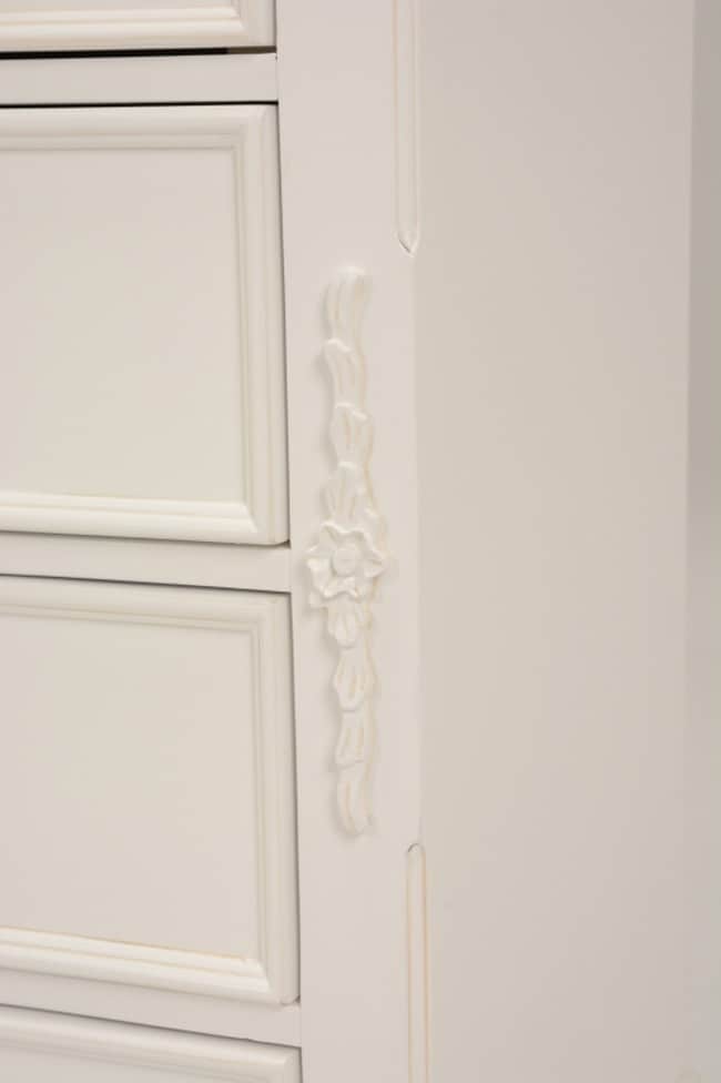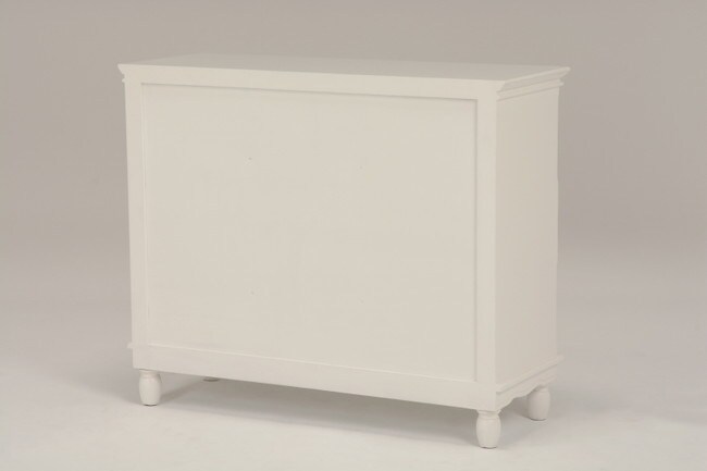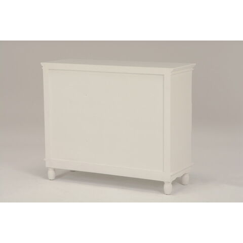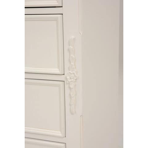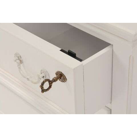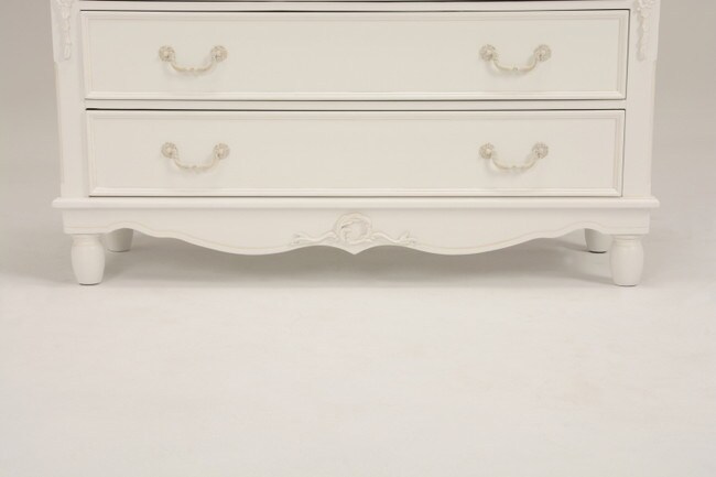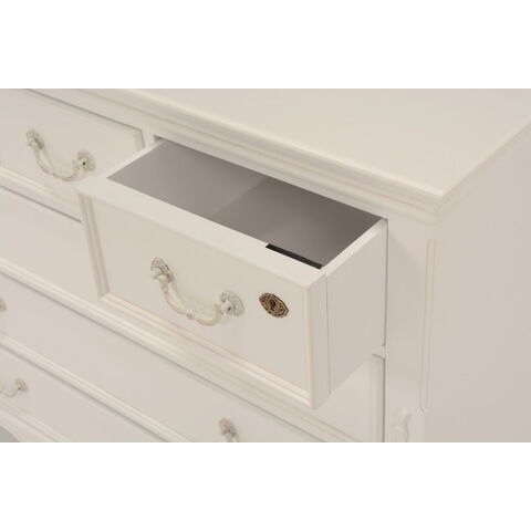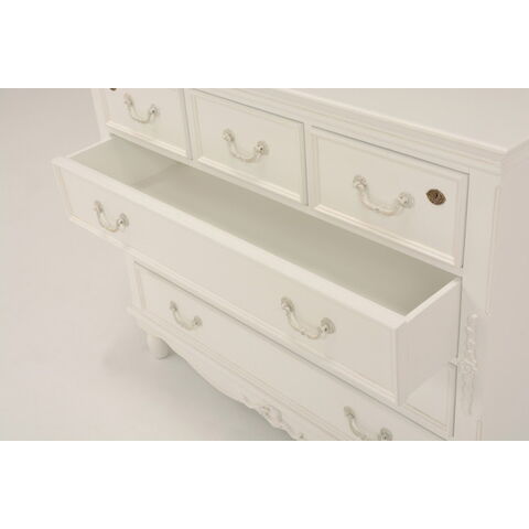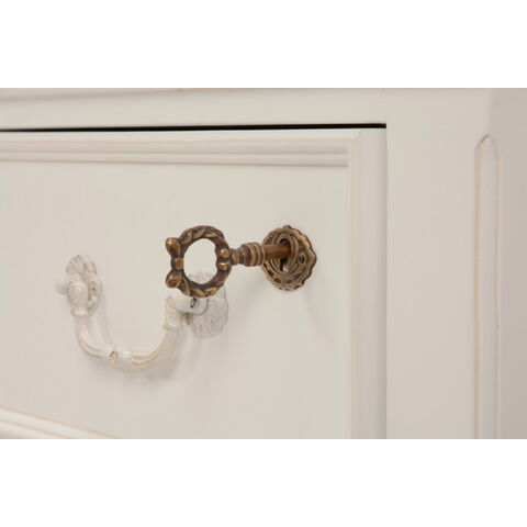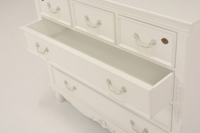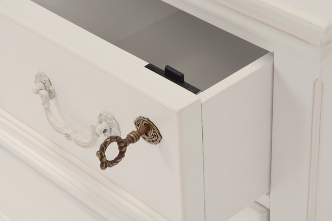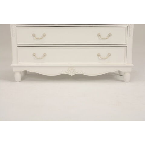 エレガントな彫刻が施された引出しつきアンティーク風ワイドチェスト。引き出し2個は鍵付き。